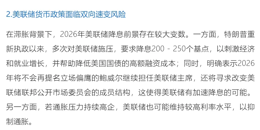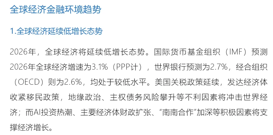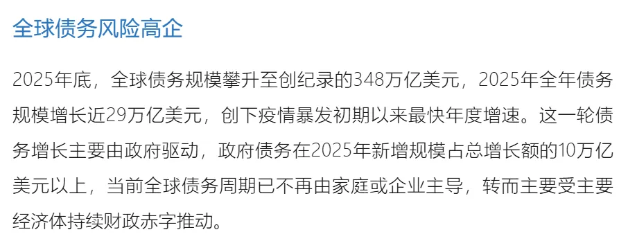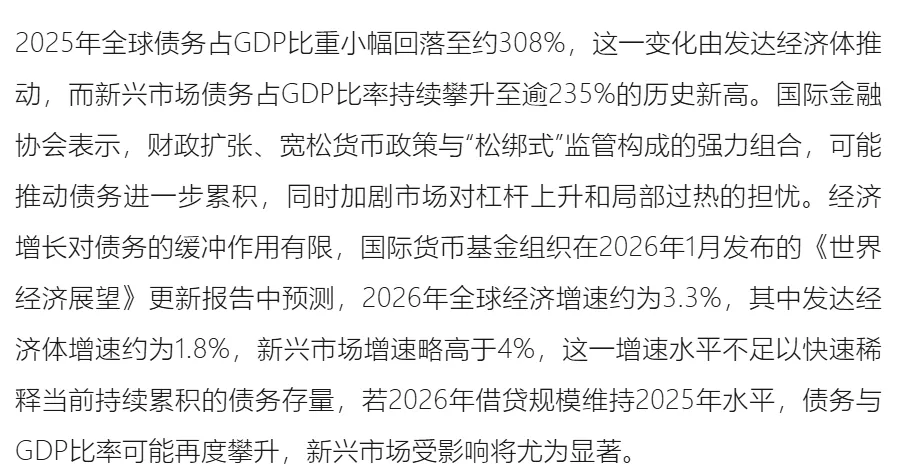 2025年全球债务占GDP比重小幅回落至约308%,这一变化由发达经济体推动,而新兴市场债务占GDP比率持续攀升至逾235%的历史新高。国际金融协会表示,财政扩张、宽松货币政策与“松绑式”监管构成的强力组合,可能推动债务进一步累积,同时加剧市场对杠杆上升和局部过热的担忧。经济增长对债务的缓冲作用有限,国际货币基金组织在2026年1月发布的《世界经济展望》更新报告中预测,2026年全球经济增速约为3.3%,其中发达经济体增速约为1.8%,新兴市场增速略高于4%,这一增速水平不足以快速稀释当前持续累积的债务存量,若2026年借贷规模维持2025年水平,债务与GDP比率可能再度攀升,新兴市场受影响将尤为显著。