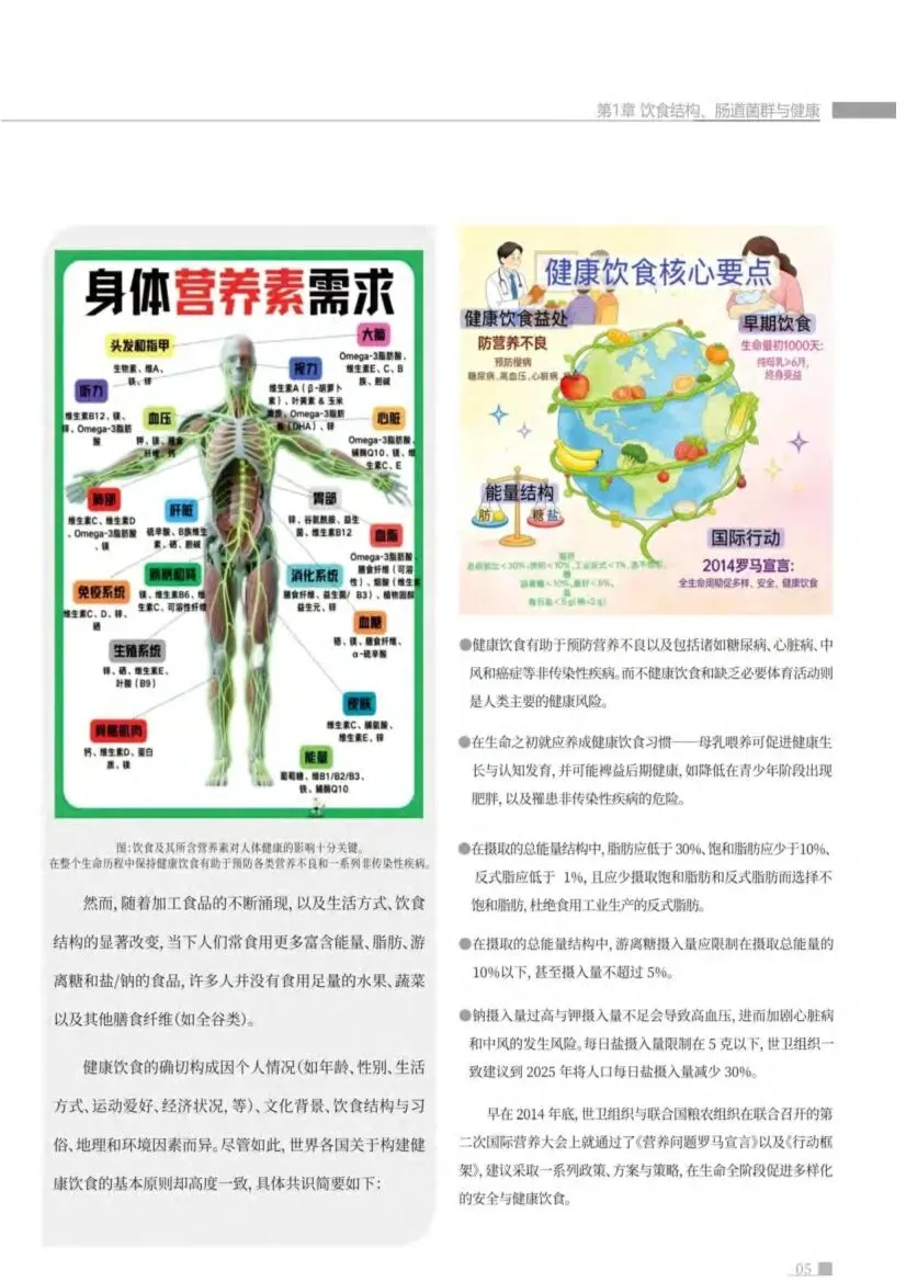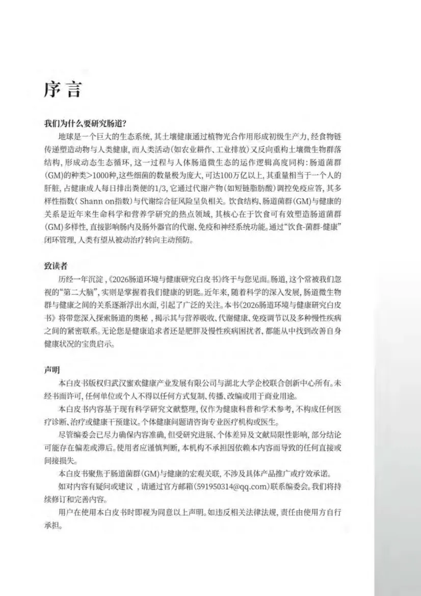 这份由蜜欢健康与湖北大学企校联合创新中心联合发布的《2026肠道环境与健康白皮书》,是一份体系严谨、内容详实、兼具科学深度与实践指导价值的权威健康科普文献。它不仅系统梳理了肠道微生物与人体健康的前沿科学共识,更构建了一个从“认识”到“干预”的完整健康管理逻辑框架。以下是对其核心内容、逻辑体系与独特价值的系统性解读分析:本报告的核心价值在于,它将复杂的肠道微生物科学转化为公众可理解、可行动的“健康生态学”指南。它超越了简单的功能罗列,通过引入 “饮食-菌群-健康” 的核心闭环与 “肠-器官轴” 的系统网络概念,将肠道定位为人体的“健康总枢纽”和“第二大脑”。这份白皮书不仅是一份科学文献综述,更是一份倡导通过管理肠道微生态来实现主动健康管理的“行动宣言”。报告构建了清晰严密的七章逻辑链条,形成了一个从认知到实践的完整闭环:1. 基础认知(第1-2章):奠定理论基础,阐述饮食、肠道菌群(GM)与健康的宏观关系,以及肠道菌群的生物学功能。2. 问题剖析(第3章):分析不同饮食习惯对菌群的具体影响,以及代谢性疾病与菌群紊乱的特征关联。3. 干预管理(第4-5章):提出正向(全植物食品)与负向(加工食品)的膳食管理策略,并系统介绍膳食纤维、菌群移植、益生元/益生菌等核心干预途径。4. 机制升华(第6-7章):通过“肠-器官轴”理论升华肠道系统性影响,并聚焦关键代谢产物“短链脂肪酸(SCFAs)”详解其多重生理功能。这一结构实现了 “科学原理→现状分析→解决方案→机制深化” 的完整论述。1. 核心理念:“饮食-菌群-健康”闭环与“肠-器官轴”网络报告开篇即确立核心范式:饮食结构是塑造肠道菌群的第一外力,菌群通过其代谢产物(如SCFAs、胆汁酸、TMAO等)作为信号分子,与宿主细胞受体相互作用,广泛调控机体的代谢、免疫、神经乃至基因表达,最终决定健康走向。这一闭环管理理念,标志着从“被动治疗疾病”到“主动塑造健康”的思维转变。更具前瞻性的是,报告用整整一章(第六章)详细阐释了“肠-器官轴”(肠-脑轴、肠-肝轴、肠-皮肤轴、肠-肺轴、肠-心轴、肠-肾轴、肠-生殖轴、肠-骨骼轴),科学论证了肠道绝不仅是消化器官,而是通过神经、内分泌、免疫和代谢通路,与全身几乎所有重要器官进行双向沟通的“核心指挥官”。这为理解许多远端器官疾病(如自闭症、脂肪肝、湿疹、心血管病等)可能与肠道健康相关提供了理论框架。报告用大量篇幅(第二章)深入浅出地阐明了肠道菌群的三大核心生物学功能:• 构建肠屏障:作为机械、化学、免疫、生物四重屏障的核心参与者,防止有害物质“漏”入体内。• 产生代谢物:将食物和宿主分泌物转化为具有全局影响的信号分子。报告特别以表格形式(表1)系统汇总了十余类菌群代谢物及其功能,信息密度极高。• 参与宿主代谢:详细讲解了SCFAs、胆汁酸、TMAO、色氨酸代谢物等关键产物的生成路径与生理病理意义。其中,短链脂肪酸(SCFAs,尤其是丁酸)被置于核心地位,第七章专章详述其抗炎、改善代谢、调节免疫、保护神经、抗癌等“八大功能”及最新研究进展。报告(第三章)通过对比地中海饮食、高纤维饮食、生酮饮食、西方饮食等多种模式,清晰揭示:• 有益模式:以全植物、高膳食纤维为特征的地中海或高纤维饮食,能增加菌群多样性,促进益生菌(如双歧杆菌、阿克曼菌)和SCFAs产生菌(如普氏栖粪杆菌)生长,与低慢病风险相关。• 风险模式:高脂、高蛋白、高精制糖、低纤维的“西方饮食”或深度加工食品,会导致菌群多样性下降,促使耐胆汁菌和致病菌增殖,产生TMAO等有害代谢物,破坏肠屏障,引发全身性低度炎症,是肥胖、糖尿病、心血管病等代谢性疾病的共同土壤。报告(第四、五章)提供了多层次、可操作的干预策略:• 膳食管理核心:旗帜鲜明地倡导增加全植物食品(蔬菜、水果、全谷物、豆类、坚果)摄入,以获取丰富的膳食纤维和植物化学物;同时警示加工食品中的高糖、高盐、不健康脂肪及食品添加剂(如人工甜味剂、乳化剂)对菌群和肠屏障的破坏作用。 ◦ 膳食纤维途径:作为最基础、最重要的干预,详细区分可溶性与不可溶性纤维的来源与功能。 ◦ 菌群移植(FMT)途径:客观介绍了其在艰难梭菌感染等疾病治疗中的潜力,也指出了其在代谢性疾病预防中应用的不确定性,并附上《菌群移植中国专家临床共识》图表,体现专业性。 ▪ 非靶向:强调规律运动、充足睡眠、定时饮食等生活方式的重要性。 ▪ 靶向:系统介绍了益生菌(各类菌株及其适应人群)与益生元(各种低聚糖的功能比较与选择)的作用机制与应用,堪称一份实用的“微生态调节剂”使用指南。报告在《声明》中明确其“健康科普和学术参考”的定位,“不构成医疗建议”,并提醒“个体差异”及研究局限性,体现了负责任的科学态度。附录列出详实的参考文献,进一步增强了其可信度。这份白皮书成功地将前沿、复杂的肠道微生物科学进行了系统化、结构化的“翻译”与整合,具有以下突出价值:1. 体系性与教育性:它并非零散知识的堆砌,而是构建了一个易于理解的科学认知体系,是公众和健康从业者学习肠道健康的优秀“教科书”。2. 科学性与前瞻性:内容扎根于大量科学研究,并引入了“肠-器官轴”等前沿概念,展现了肠道科学在整体健康观中的核心地位。