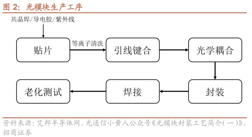 可插拔光模块生产的核心工序包括贴片、引线键合、光学耦合、封装、焊接、老化测试。