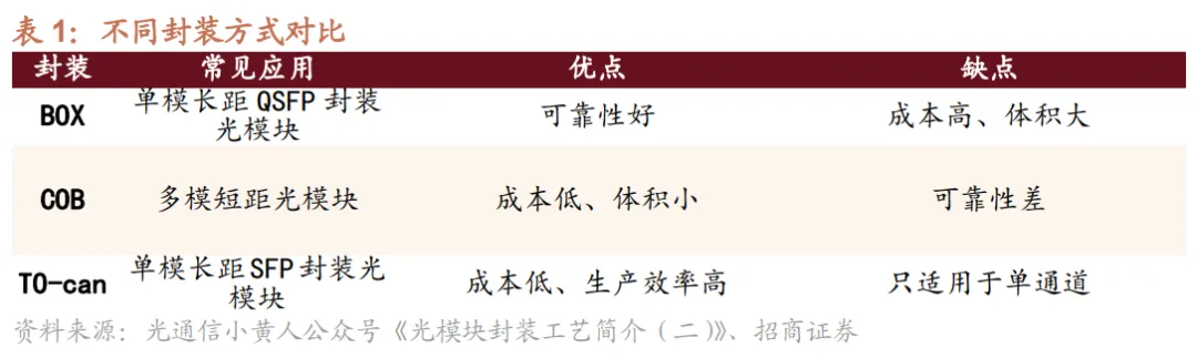 封装:光路耦合完成后,需通过外壳封装对内部光路与芯片进行保护、固定与密封,形成完整光模块。封装分为气密性与非气密性两类:气密性封装可隔绝水汽与有害气体,保护芯片及组件性能,主要采用TO-can、BOX,通过平行封焊机、激光封焊机完成密封,并配合氦检漏仪进行气密性检测,多用于环境复杂、可靠性要求高的电信及DCI长距传输场景;非气密性以COB(板上芯片)封装技术为主,通过点胶机、固化炉、外壳压合设备完成组装,常用于数据中心光模块。