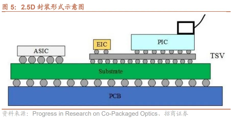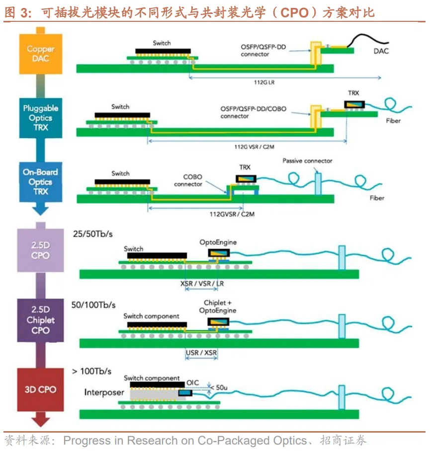 CPO(共封装光学)是一种新型的光电集成技术,通过将光引擎(OE)与交换芯片(如ASIC)共同封装在同一基板上,缩短光电信号传输路径,实现信号传输效率的提升与系统能耗的优化。根据封装结构,CPO可分为三种形式:2D封装、2.5D封装和3D封装。