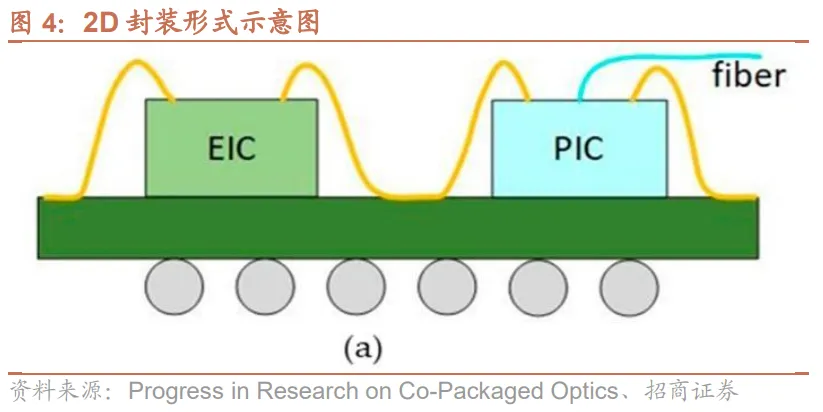 2D封装:将光芯片(PIC)和电芯片(EIC)并排放置在基板或印刷电路板(PCB)上,并通过引线或基板布线实现互连。2D封装的优势在于易于封装和灵活性高,电芯片与光芯片可分别采用不同材料与工艺独立制造。根据芯片与基板的互连方式,2D封装已形成三种技术路径:基于引线键合的CPO、基于倒装工艺的CPO以及基于扇出型晶圆封装的CPO。
