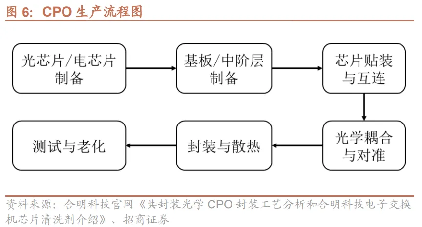 CPO的核心生产流程包括光芯片/电芯片制备、基板/中介层制备、芯片贴装与互连、光学耦合与对准、封装与散热、测试与老化。