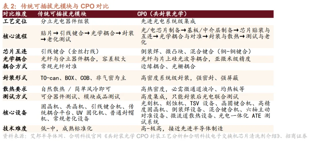 (1)芯片互连:传统光模块以引线键合为主;CPO 采用倒装焊、微凸块、混合键合等先进互连技术,互连密度、精度与难度更高。