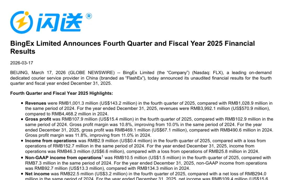 闪送2025年财报:一对一急送模式凸显优势 毛利率持续改善