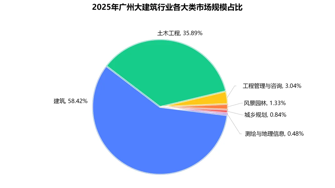 据公开采购信息,广州市2025年大建筑行业市场规模约为2660.6亿元,其中,建筑类项目市场规模约为1554.3亿元、占比58.4%,土木工程类项目市场规模约为954.9亿元、占比35.9%,工程管理与咨询类项目市场规模约80.8亿元、占比3.0%,风景园林类项目市场规模约为35.3亿元、占比1.3%,城乡规划类项目市场规模约为22.5亿元、占比0.8%,测绘与地理信息类项目市场规模约为12.8亿元、占比0.5%。