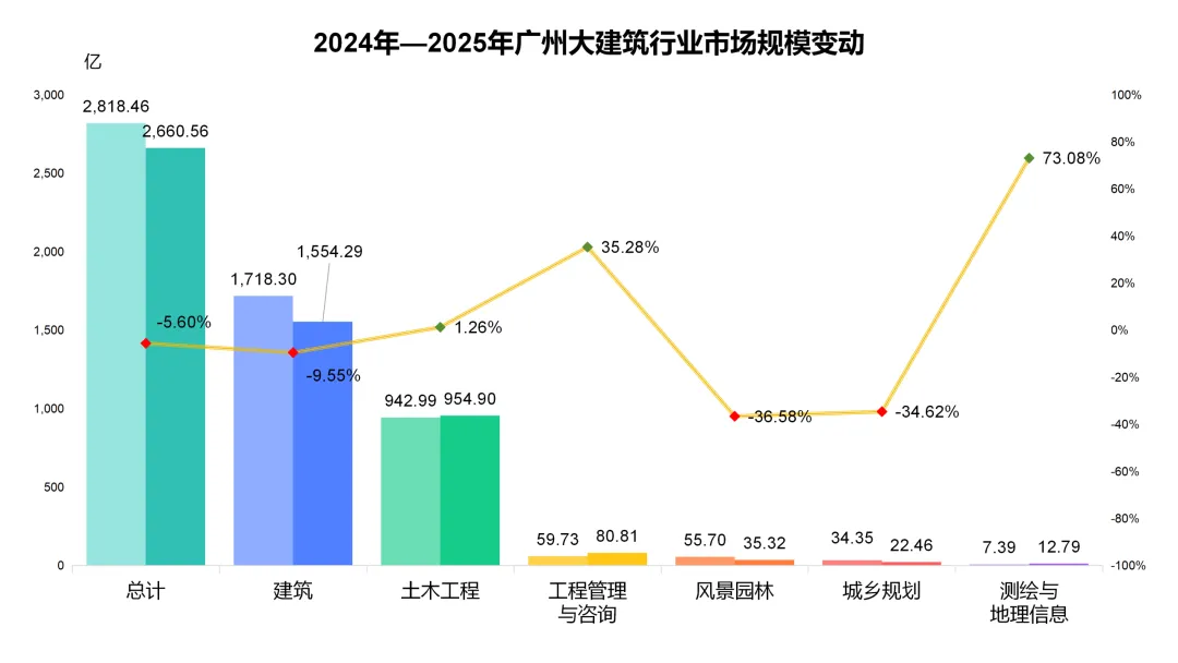总体上,2025年广州市大建筑行业呈现“整体收缩、结构稳定、细分分化”的发展态势,行业发展的核心逻辑已从“规模扩张”转向“结构优化、质量提升”。建筑类与土木工程类项目仍占据绝对主导地位,建筑类项目受传统地产需求收缩影响持续下滑,土木工程类项目凭借基建补短板政策的支撑实现小幅增长,略微缓解了行业下行压力;风景园林、城乡规划等传统服务板块受政策管控、需求收缩等因素影响持续承压,市场规模大幅下滑;而工程管理与咨询、测绘与地理信息等细分服务板块则借助政策资金的东风实现逆势增长,成为行业收缩背景下的“增长亮点”,预示广州大建筑行业逐步从“传统建造”向“智慧服务、精细管理”转型的开始。