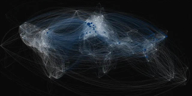 2019 年全球航空网络概况及特征向量中心性排名前列的核心枢纽城市。图中节点代表有机场的城市,连线代表直飞航线,节点的大小与颜色则根据特征向量中心性指标,凸显出处于核心地位的城市。