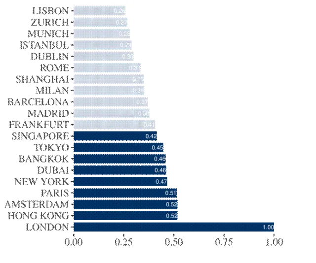 新加坡拥有约6000家年营收不低于500万美元的大中型外资子公司,数量位居全球所有城市首位。在本次研究的各项连通性指标中,新加坡的特征向量中心性评分名列前茅,与伦敦、巴黎、中国香港、迪拜、东京等城市比肩,这也体现出新加坡与其他高连通性机场城市建立了极具战略意义的航线连接。上述格局表明,全球航空连通性是影响跨国企业选址的重要因素之一;当然,除了这一因素外,还有其他一些本次研究未纳入考察的因素,也会对企业的选址产生作用。