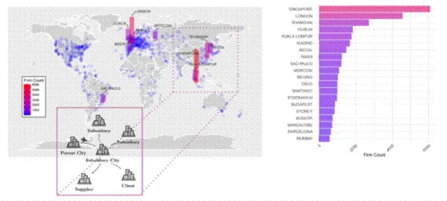 2023年跨国企业子公司的全球分布情况。每个点代表一个机场城市,颜色深浅表示2023年该城市的外资跨国企业子公司数量(红色代表数量最多)。右侧面板为子公司数量排名前20的城市。(图片来源:SMART M3S)