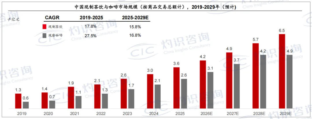 数据显示,2025 年中国现制茶饮市场规模约 3600 亿元,预计 2029 年将攀升至 6500 亿元;同期零售茶饮、周边及生活零售市场也将同步扩容,2029 年整体可触达超 6.5 万亿元的市场空间。行业增长逻辑已发生根本转变:2019-2025 年现制茶饮保持 17.8% 的高增速,2025-2029 年增速放缓至 15.8%,从 “规模扩张” 转向 “存量深耕”,与现磨咖啡赛道增速基本拉平,市场竞争进入精细化运营阶段。