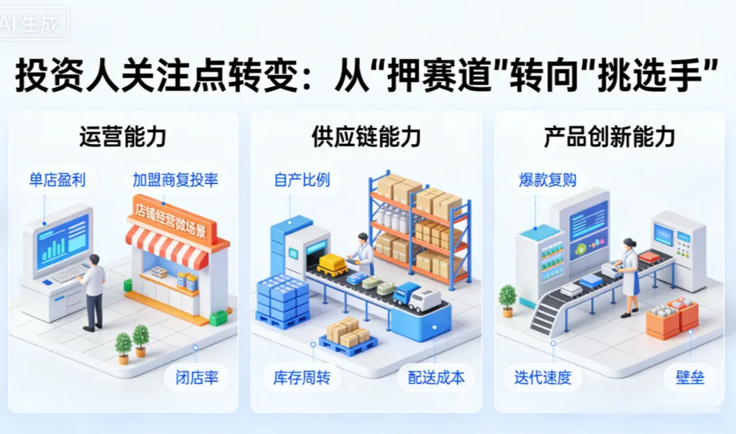 投资人的关注点已彻底转变:从 “押赛道” 转向 “挑选手”,核心考察三大能力 ——运营能力(单店盈利、加盟商复投率、闭店率)、供应链能力(自产比例、库存周转、配送成本)、产品创新能力(爆款复购、迭代速度、壁垒)。同时,行业进入并购整合新阶段,君乐宝入股茉酸奶、蜜雪收购鲜啤福鹿家,头部通过并购拓展品类边界;港股成为品牌上市首选,审核周期短、估值更合理,成为新茶饮资本化的核心渠道。