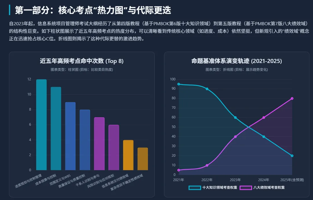 在过去的长达二十年的考试周期中,高项论文的命题焦点始终紧密围绕着项目管理实践中的痛点与难点展开。通过对近5年(2021年至2025年)试题样本的精准抽样、聚类与统计,可以清晰地绘制出一幅考点演变的“热力图”,揭示出命题重心的结构性转移以及新老知识体系的剧烈交替1。高频考点识别与演变周期纵览