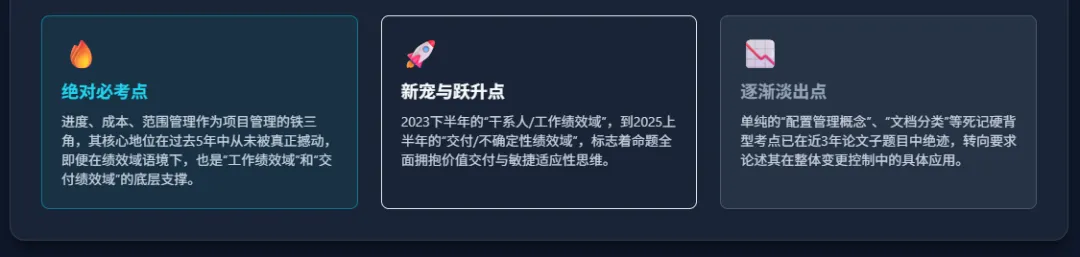 传统知识领域 | 资源、干系人与沟通 | 40% | 20% | 15% | 权重持续下降:从2023年下半年四批次连考的高潮期逐渐退热,相关沟通与人员调度考点全面向“团队绩效域”和“干系人绩效域”转移整合。 |