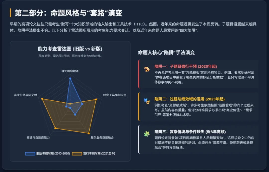 该数据矩阵清晰地指明,基于PMBOK第六版的传统流程模块正在经历权重的严重稀释,而基于价值与原则导向的第七版绩效域模块正在快速抢占核心分值区域,成为决定考生能否顺利通过论文科目的关键胜负手1。第二部分:命题风格与“套路”演变
