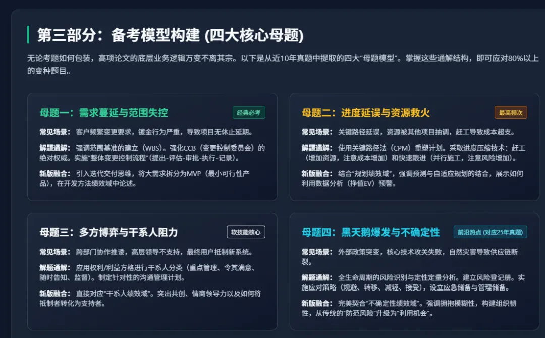 其一,项目背景的“绝对信度”构建。考生所描述的背景底座项目必须具备足够庞大的体量规模(行业内默认及阅卷潜规则通常建议总投资额在500万元人民币以上,实施周期长达半年至一年以上,涉及多级承包商与跨部门多方协作),且必须带有极其鲜明的时代前沿技术特征(如微服务架构、大数据中台流式计算、AI大模型私有化部署工程化等),传统的简单网页制作或局域网搭建项目将直接被判定为格局过小而不予及格1。其二,管理工具应用的深度情境化。在论述中决不能空洞地泛泛而谈“我使用了德尔菲法”或是“我采用了挣值分析”,而必须具体落地到特定情境中:“在应对核心国产化数据库替代迁移这一高度技术不确定性风险时,我紧急组织了三轮背靠背的资深架构师匿名评审,利用宽带德尔菲法彻底收敛了关于底层数据一致性校验的技术分歧”1。其三,宏观商业战略视角的强制引入。在新的交付绩效域和不确定性绩效域的严酷考核中,高级项目经理被强行要求具备类似于高级产品经理、甚至企业业务线负责人的拔高视角。论文不能仅仅局限于对代码交付和服务器按时上架负责,更要对该信息系统最终带来的业务流程流转效率提升、运营成本的规模化削减以及组织顶层战略的真正落地负责1。这就要求考生在字里行间必须展现出极强的商业敏锐度与战略对齐能力。第三部分:备考模型构建(核心输出)