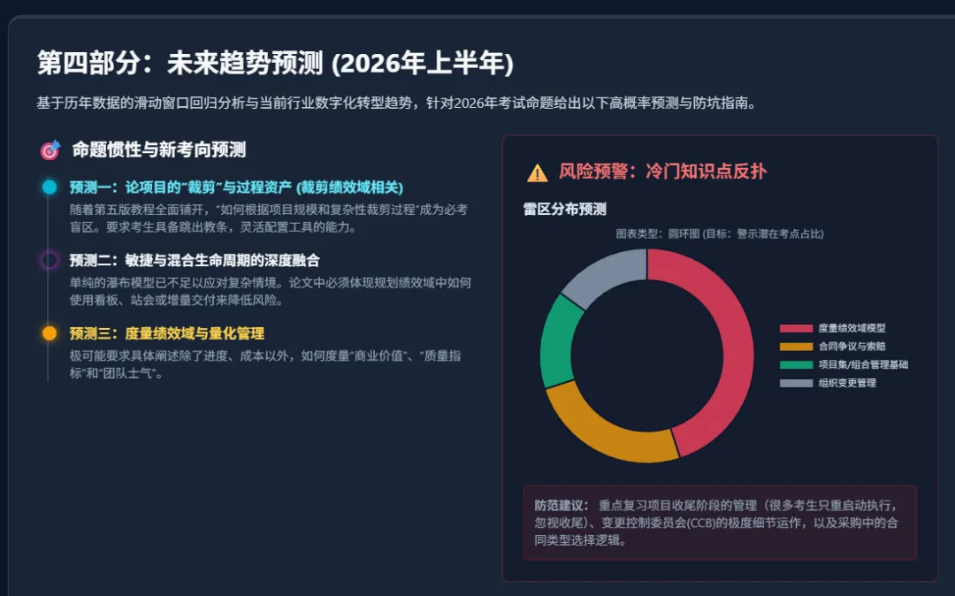 这是为了全面适应第四版官方教材与PMBOK第七版革命性改版而诞生的终极融合高维模型,重点用于应对系统要求灵活性极高、前端需求变更极其频繁、后端要求绝对稳定的割裂场景考查1。解题通解:在当前的机考评卷标准下,传统的“一套预测型瀑布流走天下”的八股文已无法满足阅卷专家的挑剔眼光。在本文中,项目背景必须被设定为极具时代感的“双模IT(Bimodal IT)”复杂环境:即前端移动端用户交互界面需求需要以周为单位快速迭代,而后台核心的金融账务清算系统则要求金融级的极度稳定与零缺陷。此通解的核心在于大篇幅论述“裁剪(Tailoring)”的纠结与决策过程1。对后台稳定大系统依然采用传统的预测型生命周期严格管理(实施严苛的WBS分解和深度的基准变更控制CCB);而对前端应用则果断引入敏捷Scrum方法论。论述中需生动且详细地说明如何开展每日站会(Daily Scrum)以识别阻碍,如何进行迭代规划(Sprint Planning)与冲刺回顾(Sprint Retrospective),如何使用物理或电子看板(Kanban)进行可视化工作流管理以限制在制品(WIP),并通过燃烧图(Burndown Chart)精准监控每一次迭代的进度消耗速度。在此顶配模型中,项目经理的角色将完成一次华丽的升华,从传统的“生硬指令发布者”向“服务型领导(Servant Leader)”与“敏捷教练(Scrum Master)”彻底转变,字里行间流露出的核心理念在于清除团队内部障碍、屏蔽外部政治干扰,并全力促进业务价值的持续、高频交付。以上八大母题模型并非孤立存在,而是相互交织、血脉相连,共同构成了高项论文备考的终极矩阵体系。对于志在必得的备考者而言,只需在平时精心准备1至2个详实可靠、数据极其丰满、自身具有深度参与度的大型信息系统项目作为万能“底座”,在考场上面对千变万化的机考题目时,只需提取题干核心要素,将其灵活嵌入上述任一适配模型,进行参数的替换与逻辑的延展,便可从容不迫地应对所有已知与未知的考核难题1。第四部分:未来趋势预测 (2026年上半年)