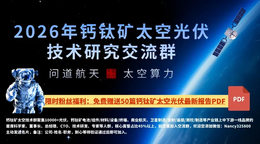 粉丝福利:为助力科研工作者深耕钙钛矿太空应用领域,推动技术创新与产业发展,群内将不定期分享钙钛矿太空应用领域的前沿技术资料与行业资源,内容均为行业前沿成果。欢迎各位邀请企业和研发人员入群交流,凝聚行业智慧,携手推动钙钛矿技术在航天领域的创新突破与产业化应用,共促行业高质量发展!