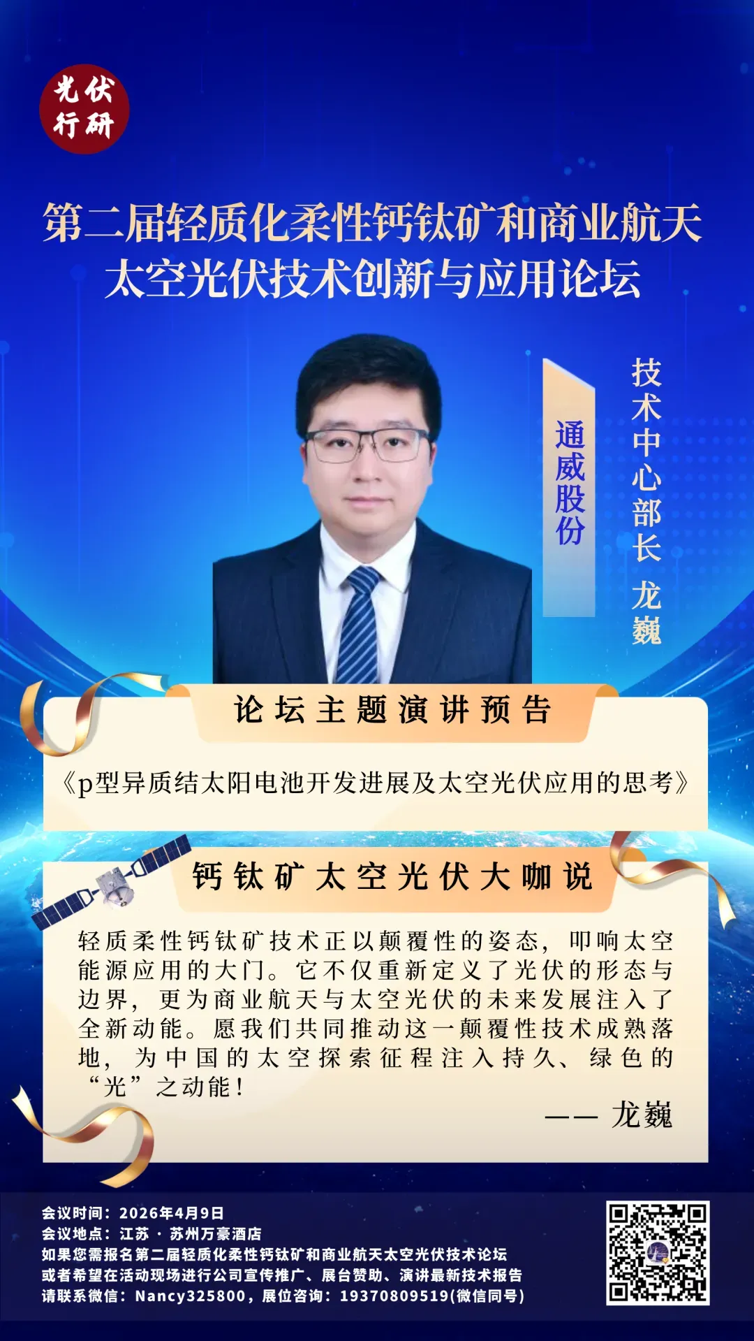 第二届轻质化柔性钙钛矿和商业航天太空光伏技术创新与应用论坛将于2026年4月9日在江苏 · 苏州举办,通威股份光伏技术中心部长 龙巍将作《p型异质结太阳电池开发进展及太空光伏应用的思考》主题分享,诚邀业界同仁一起探讨交流。
