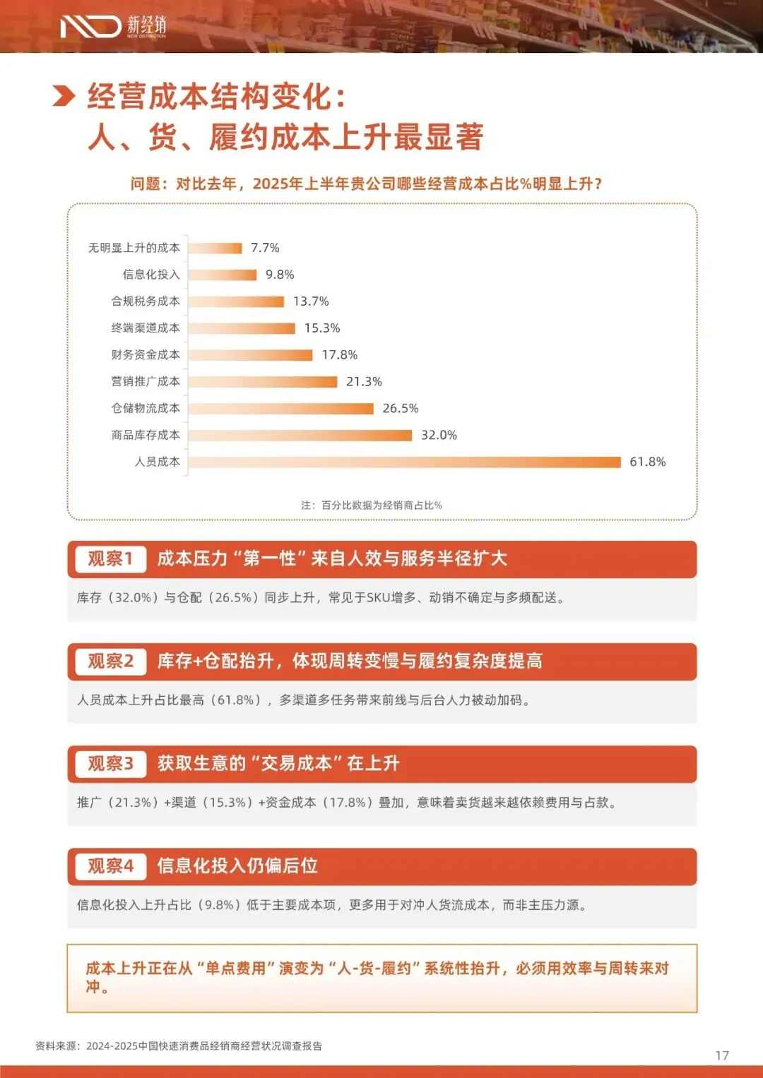 利润下滑:53.6%的经销商利润下滑,呈现“增收不增利”现象。 分化加剧:39.6%的经销商超额完成目标,38.8%未达标,行业进入强分化周期。 成本压力:人、货、履约成本攀升,叠加毛利挤压与库存周转慢,形成三重压力。 渠道变革