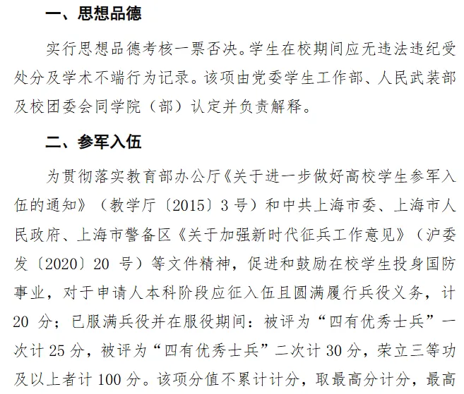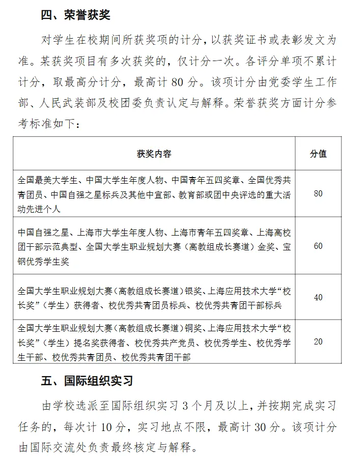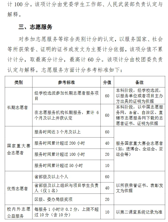 综合素质评价主要包括学生的思想品德考核、参军入伍服兵役情况、志愿服务、荣誉获奖、到国际组织实习等方面,总分不得超过上限分值(100分)。其中,学生在某一方面有多项计分情况的,只取1项最高分参与计分。