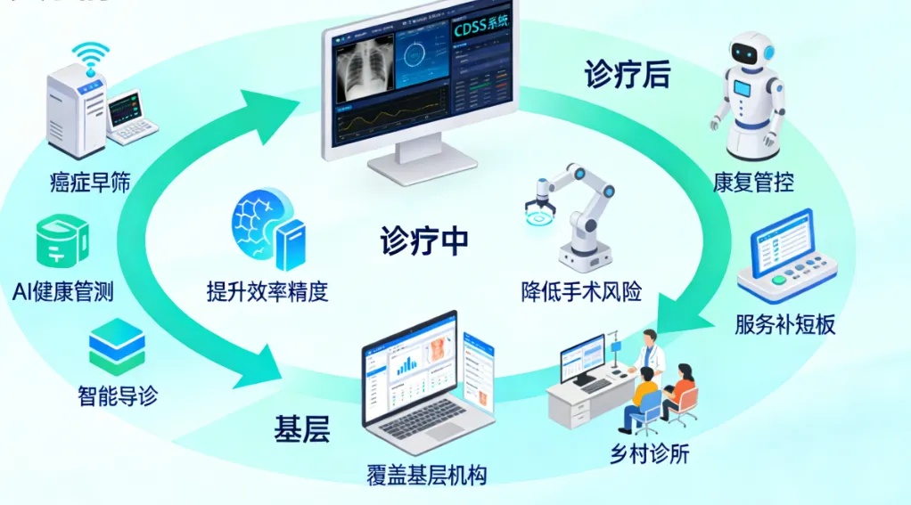 行业面临四大核心痛点:一是数据安全与隐私保护凸显,数据孤岛、同质化影响模型训练;二是算法可解释性不足,“黑箱”问题难以获得医患完全信任;三是复合型人才短缺,制约技术研发与落地;四是商业化路径模糊,多数企业亏损,医保支付不完善,医疗机构应用动力不足。2025年,AI医疗技术突破聚焦“效率、精度、适配”,围绕大模型、多模态融合、算力普惠三大方向发力。医疗大模型向“专业化、高效化”升级,从通用型转向专科化集群。卫宁健康WiNGPT-3.5-turbo采用混合专家架构,降低推理成本,便于基层部署;DeepSeek-R1以低训练成本打破算力神话。同时,WiNGPT-3.0提升可解释性,实现具备临床逻辑的循证推理。多模态数据融合技术实现跨越,整合多维度医疗数据,给出综合诊断建议。瑞金医院“智慧诊疗平台”服务超10万患者,双渠道检索技术Top-3召回率达90.67%,解决医疗知识时效性难题。算力体系向普惠化转型,华为昇腾技术突破,小型推训设备进入医院,桌面级设备降价,打破算力垄断。卫宁健康训练平台适配昇腾910B,支持院内小样本微调,推动AI向基层下沉。2025年,AI医疗应用形成“诊疗前-诊疗中-诊疗后”闭环,向基层、公共卫生领域拓展。诊疗前,AI赋能疾病早筛与健康评估,仁度生物早筛系统提升癌症检出率,AI健康管家实现动态干预,智能导诊优化就医流程,减少等待时间。诊疗中,AI辅助提升效率与精度,影像AI覆盖多部位多病种,CDSS推送诊疗建议,AI手术机器人扩大应用,降低手术风险。诊疗后,AI助力康复与慢病管控,康复机器人制定个性化方案,慢病系统提醒用药复查,AI填补安宁疗护、精神卫生服务短板。基层领域,AI破解资源短缺难题,远程AI问诊、辅助诊断让偏远地区享受优质资源,AI培训提升基层医生能力,截至2025年底,AI辅助诊断系统覆盖大部分基层机构。未来3-5年,AI医疗将进入高质量、规模化、规范化发展新阶段,呈现四大趋势。趋势一:政策持续完善,监管细化审批、数据安全规范,扩大医保支付范围,2027年将形成四级智能诊疗平台。趋势二:技术向精准化、可解释化、普惠化发展,专科大模型提升精度,多模态推动个性化医疗,AI向基层深度下沉。趋势三:应用场景拓展,形成全产业链生态,AgenticAI进入实战,推动AI从“被动工具”向“主动协作者”转变。趋势四:商业化路径清晰,盈利模式多元化,预计2030年中国市场规模突破3000亿元,形成成熟商业生态。2025年,AI医疗迎来发展机遇,技术、场景、政策协同发力,从“技术探索”走向“临床赋能”,但也面临诸多挑战。未来,随着政策完善、技术迭代、市场成熟,AI医疗将重构医疗体系,打破资源壁垒,惠及更多群众。各方需协同发力,聚焦临床需求、完善监管、把握投资机遇,助力“健康中国”战略实现,开启医疗智能化新时代。