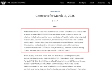 美战争部网站2026年3月13日发布一条合同公告,据估算,合同总额约达252亿美元。其中,安杜里尔(Anduril)公司被授予了一份总额达200亿美元的固定价格合同——这是美国迄今为止规模最大的人工智能国防合同。