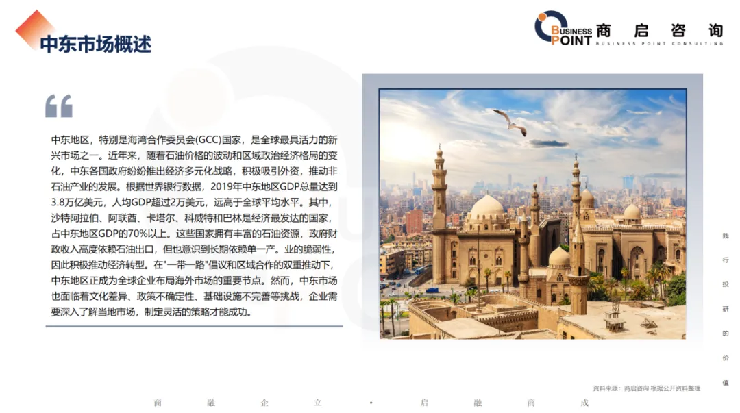 中东地区,特别是海湾合作委员会(GCC)国家,是全球最具活力的新兴市场之一。近年来,随着石油价格的波动和区域政治经济格局的变化,中东各国政府纷纷推出经济多元化战略,积极吸引外资,推动非石油产业的发展。根据世界银行数据,2019年中东地区GDP总量达到3.8万亿美元,人均GDP超过2万美元,远高于全球平均水平。其中,沙特阿拉伯、阿联酋、卡塔尔、科威特和巴林是经济最发达的国家,占中东地区GDP的70%以上。这些国家拥有丰富的石油资源,政府财政收入高度依赖石油出口,但也意识到长期依赖单一产。业的脆弱性,因此积极推动经济转型。在"一带一路"倡议和区域合作的双重推动下,中东地区正成为全球企业布局海外市场的重要节点。然而,中东市场也面临着文化差异、政策不确定性、基础设施不完善等挑战,企业需要深入了解当地市场,制定灵活的策略才能成功。