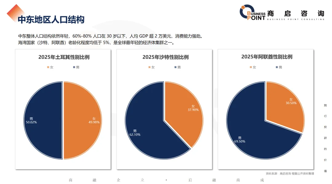 中东整体人口结构依然年轻,60%-80% 人口在 30 岁以下,人均 GDP 超 2 万美元,消费能力强劲。