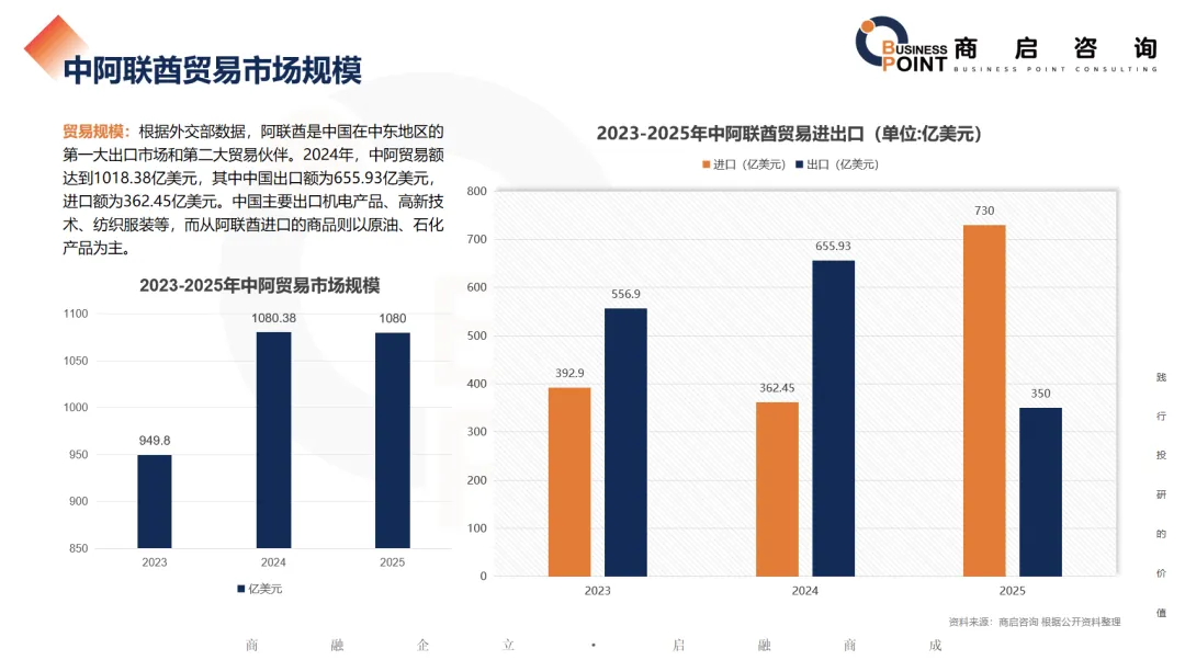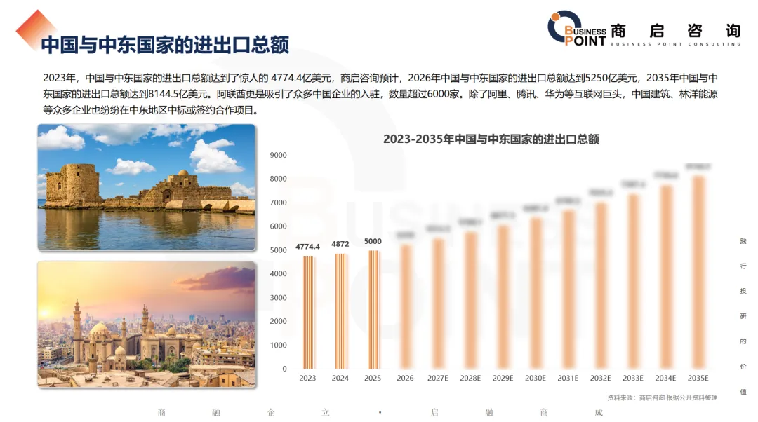 2023年,中国与中东国家的进出口总额达到了惊人的 4774.4亿美元,商启咨询预计,2026年中国与中东国家的进出口总额达到5250亿美元,2035年中国与中东国家的进出口总额达到8144.5亿美元。阿联酋更是吸引了众多中国企业的入驻,数量超过6000家。除了阿里、腾讯、华为等互联网巨头,中国建筑、林洋能源等众多企业也纷纷在中东地区中标或签约合作项目。