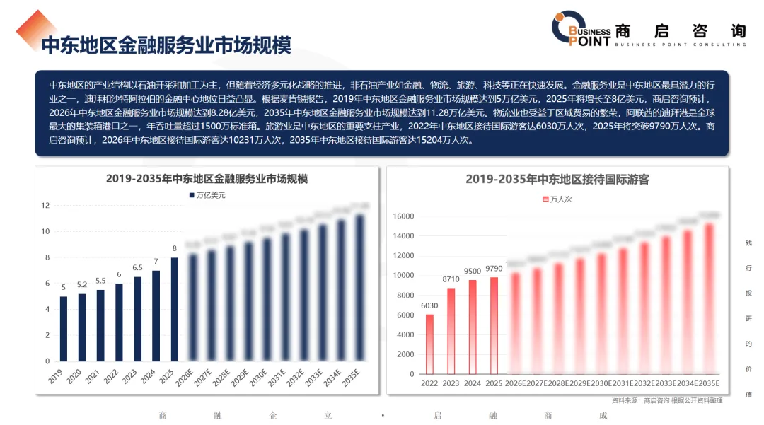 中东地区的产业结构以石油开采和加工为主,但随着经济多元化战略的推进,非石油产业如金融、物流、旅游、科技等正在快速发展。金融服务业是中东地区最具潜力的行业之一,迪拜和沙特阿拉伯的金融中心地位日益凸显。根据麦肯锡报告,2019年中东地区金融服务业市场规模达到5万亿美元,2025年将增长至8亿美元,商启咨询预计,2026年中东地区金融服务业市场规模达到8.28亿美元,2035年中东地区金融服务业市场规模达到11.28万亿美元。物流业也受益于区域贸易的繁荣,阿联酋的迪拜港是全球最大的集装箱港口之一,年吞吐量超过1500万标准箱。旅游业是中东地区的重要支柱产业,2022年中东地区接待国际游客达6030万人次,2025年将突破9790万人次。商启咨询预计,2026年中东地区接待国际游客达10231万人次,2035年中东地区接待国际游客达15204万人次。