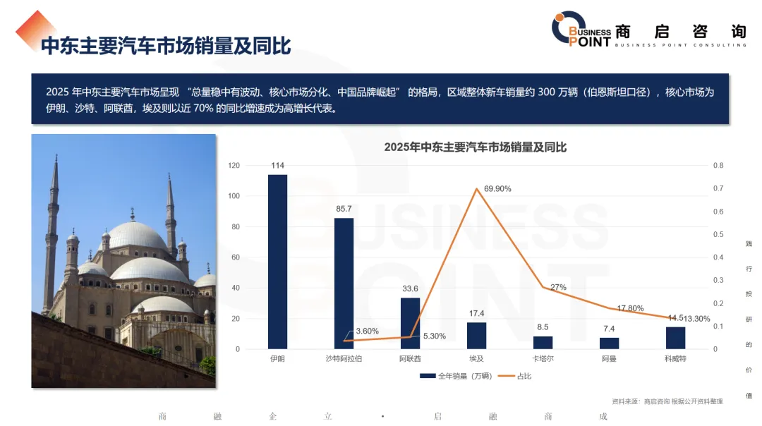 2025 年中东主要汽车市场呈现 “总量稳中有波动、核心市场分化、中国品牌崛起” 的格局,区域整体新车销量约 300 万辆(伯恩斯坦口径),核心市场为伊朗、沙特、阿联酋,埃及则以近 70% 的同比增速成为高增长代表。