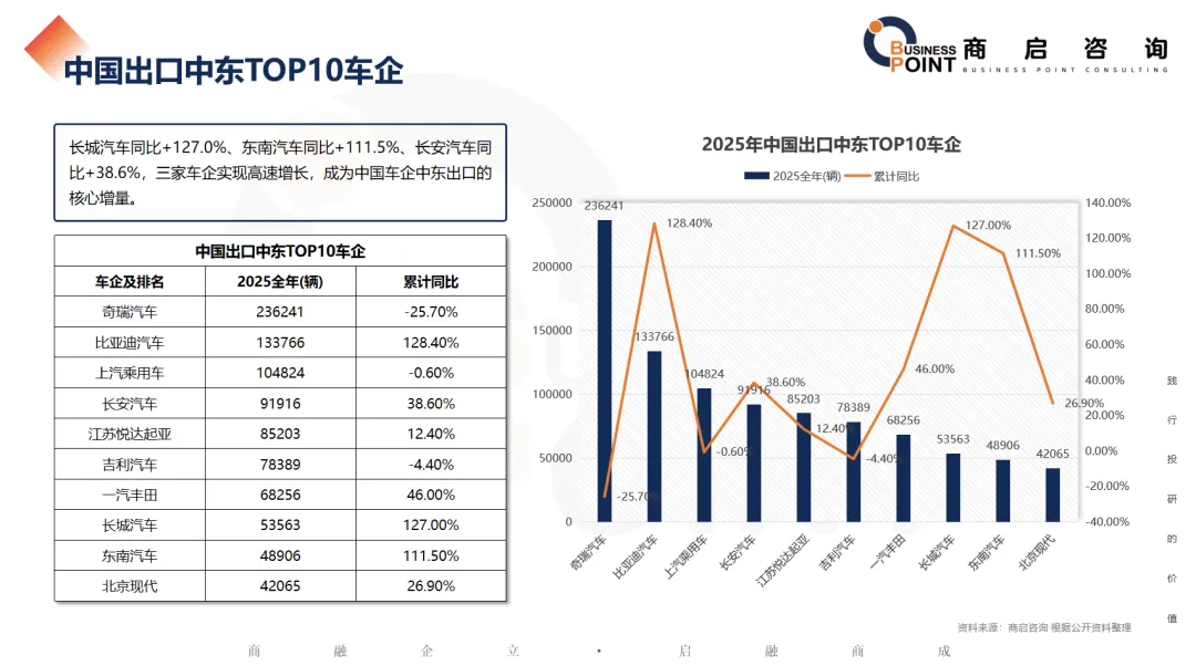 长城汽车同比+127.0%、东南汽车同比+111.5%、长安汽车同比+38.6%,三家车企实现高速增长,成为中国车企中东出口的核心增量。