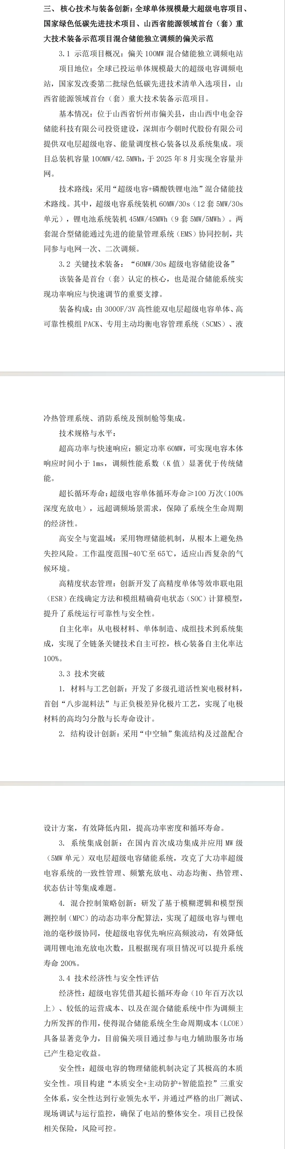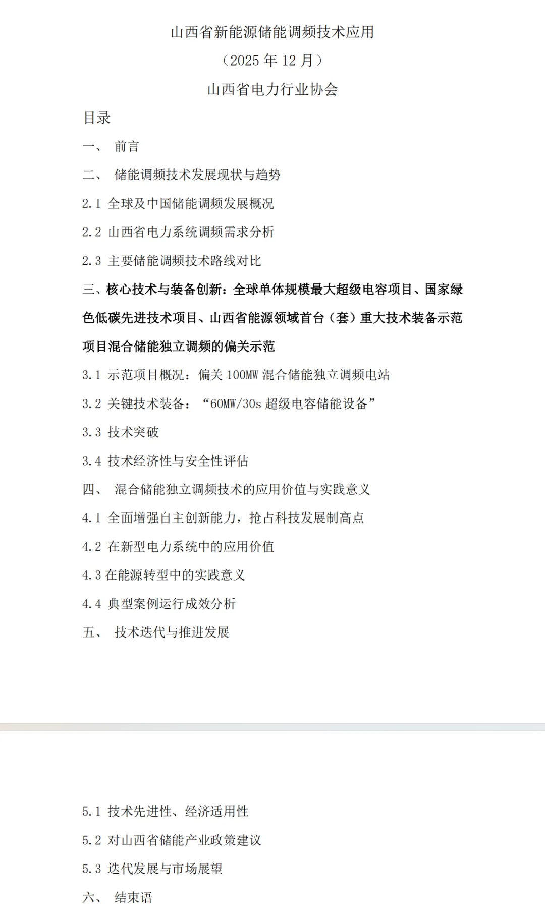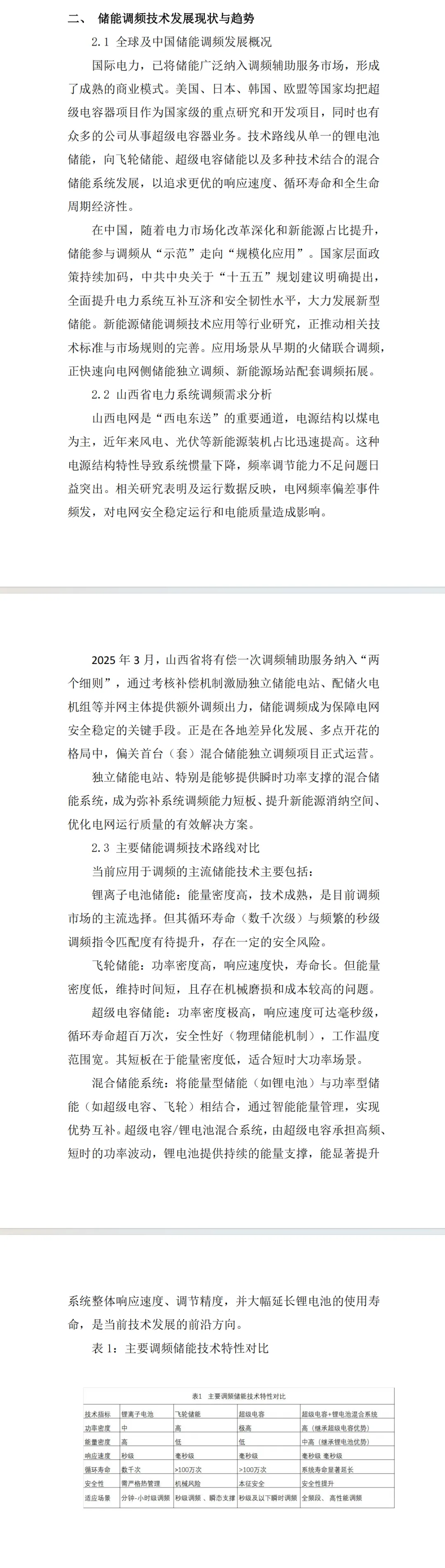 今日分享:山西省新能源储能调频技术应用白皮书(2025年12月).pdf《山西省新能源储能调频技术应用白皮书(2025年12月)》聚焦储能调频技术在山西的实践与展望。随着新能源装机占比超47%,山西电网调频压力剧增,储能需求缺口巨大。白皮书以偏关100MW混合储能独立调频电站为核心案例,该项目采用“60MW/30s超级电容+45MW/45MWh锂电池”混合技术,是全球单体规模最大的超级电容调频电站,入选国家绿色低碳先进技术清单及山西省首台(套)重大技术装备。超级电容具备毫秒级响应、百万次循环寿命和高安全性,与锂电池协同显著提升调频性能与系统寿命。项目验证了混合储能在提升电网频率稳定、增强新能源消纳、保障供电质量等方面的价值,并已形成稳定收益。白皮书提出强化政策引导、加快标准建设、打造产业集群等建议,展望未来5-10年储能调频市场将达千亿级,为全国新型电力系统建设提供“山西方案”。看完记得转发朋友圈+行业交流群,让更多同行伙伴受益~后期小编还会持续分享更多资料、千万别错过!.............................扫码加入星球会员即可下载使用,只需0.79元/天,每天更新50份行业资料(行业前沿技术文档、企业实践案例、政策标准解读与科研成果,覆盖技术研发、项目落地、市场应用全维度,是储能从业者、研究者获取核心资源的核心阵地等)