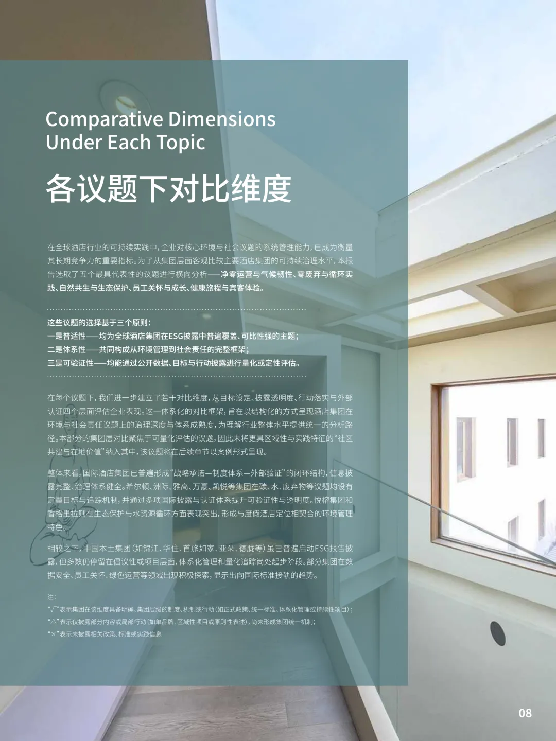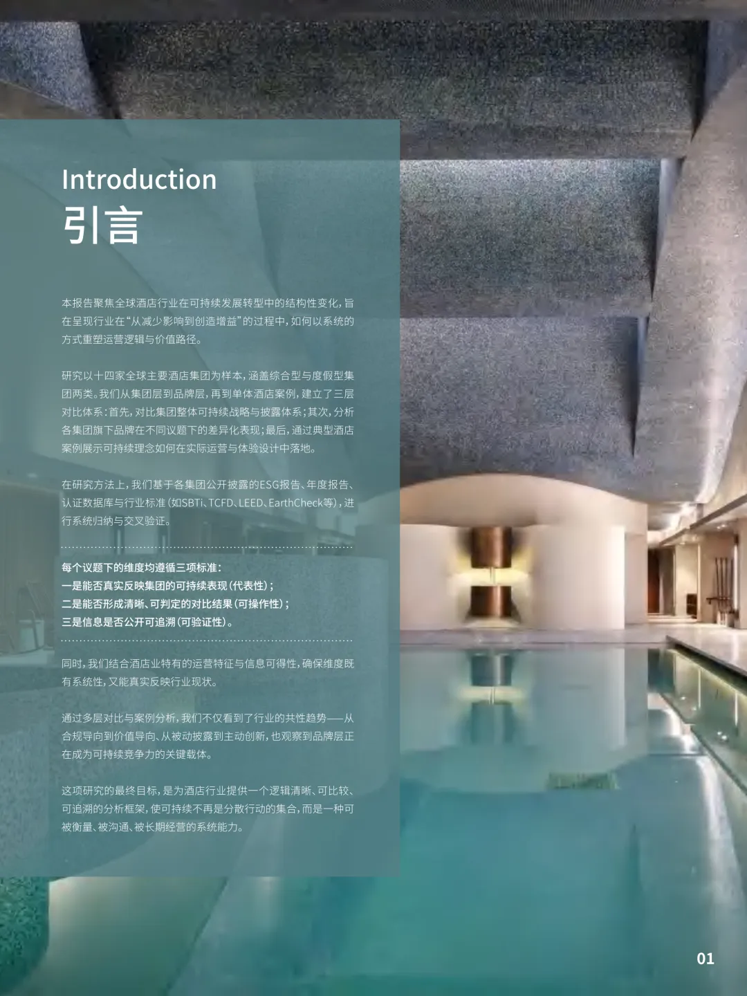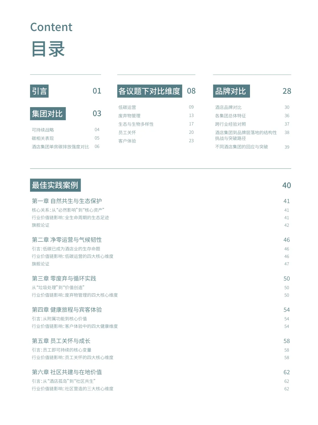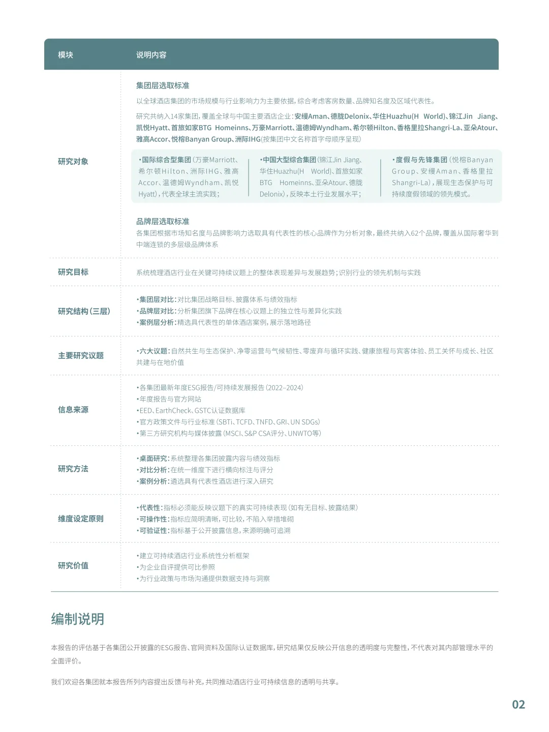报告聚焦全球酒店行业可持续发展转型,以十四家主流酒店集团为研究样本,构建集团、品牌、单店三层对比体系,系统分析六大核心议题。研究基于公开 ESG 报告、国际认证数据与行业标准,从战略披露、实践落地到外部验证全方位呈现行业现状。行业呈现明显分层特征,国际集团多已建立完整的可持续治理体系,在碳减排、废弃物管理等领域设有量化目标与追踪机制。本土集团虽启动 ESG 披露,但多停留在倡议层面,体系化管理尚处起步阶段。品牌层成为竞争力关键载体,部分领先品牌已形成独立可持续定位与实践路径。可持续实践已从单一环保举措转向全价值链整合,涵盖生态保护、净零运营、循环利用、健康体验、员工关怀与社区共建。报告通过典型案例揭示,成功实践需打通战略传导、体验设计与多方共创,让可持续从管理议题转化为品牌核心价值与用户可感知的生活方式。