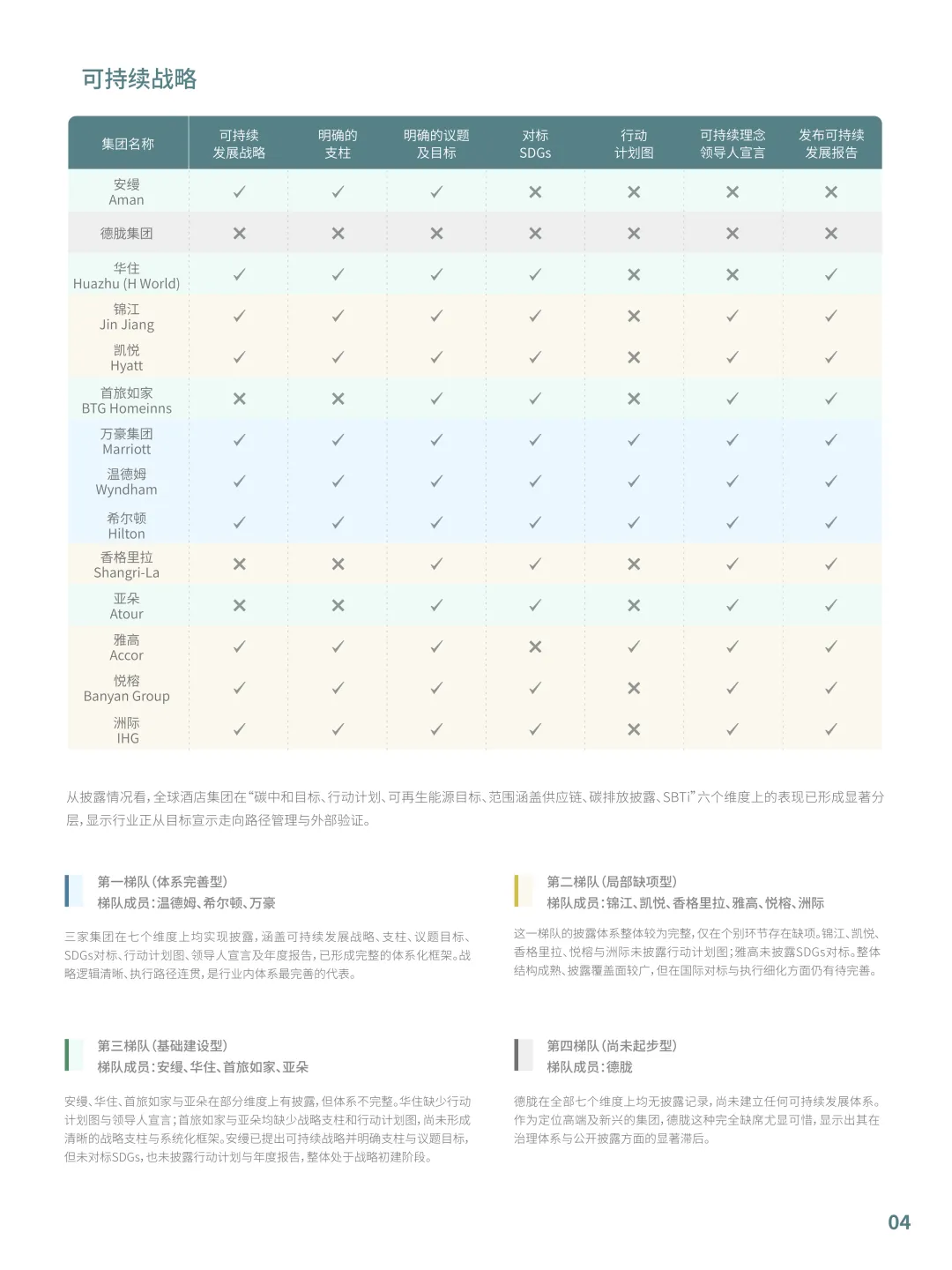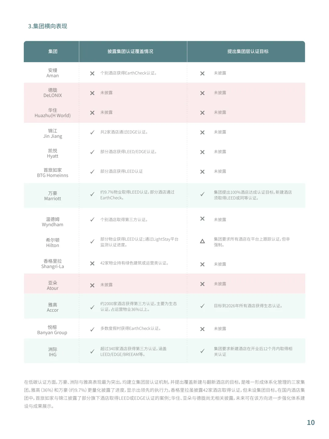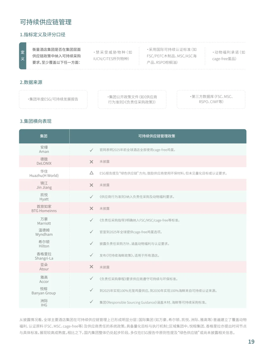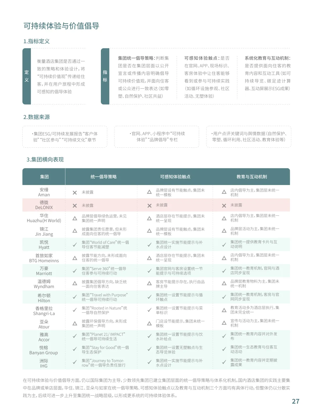 报告聚焦全球酒店行业可持续发展转型,以十四家主流酒店集团为研究样本,构建集团、品牌、单店三层对比体系,系统分析六大核心议题。研究基于公开 ESG 报告、国际认证数据与行业标准,从战略披露、实践落地到外部验证全方位呈现行业现状。行业呈现明显分层特征,国际集团多已建立完整的可持续治理体系,在碳减排、废弃物管理等领域设有量化目标与追踪机制。本土集团虽启动 ESG 披露,但多停留在倡议层面,体系化管理尚处起步阶段。品牌层成为竞争力关键载体,部分领先品牌已形成独立可持续定位与实践路径。可持续实践已从单一环保举措转向全价值链整合,涵盖生态保护、净零运营、循环利用、健康体验、员工关怀与社区共建。报告通过典型案例揭示,成功实践需打通战略传导、体验设计与多方共创,让可持续从管理议题转化为品牌核心价值与用户可感知的生活方式。