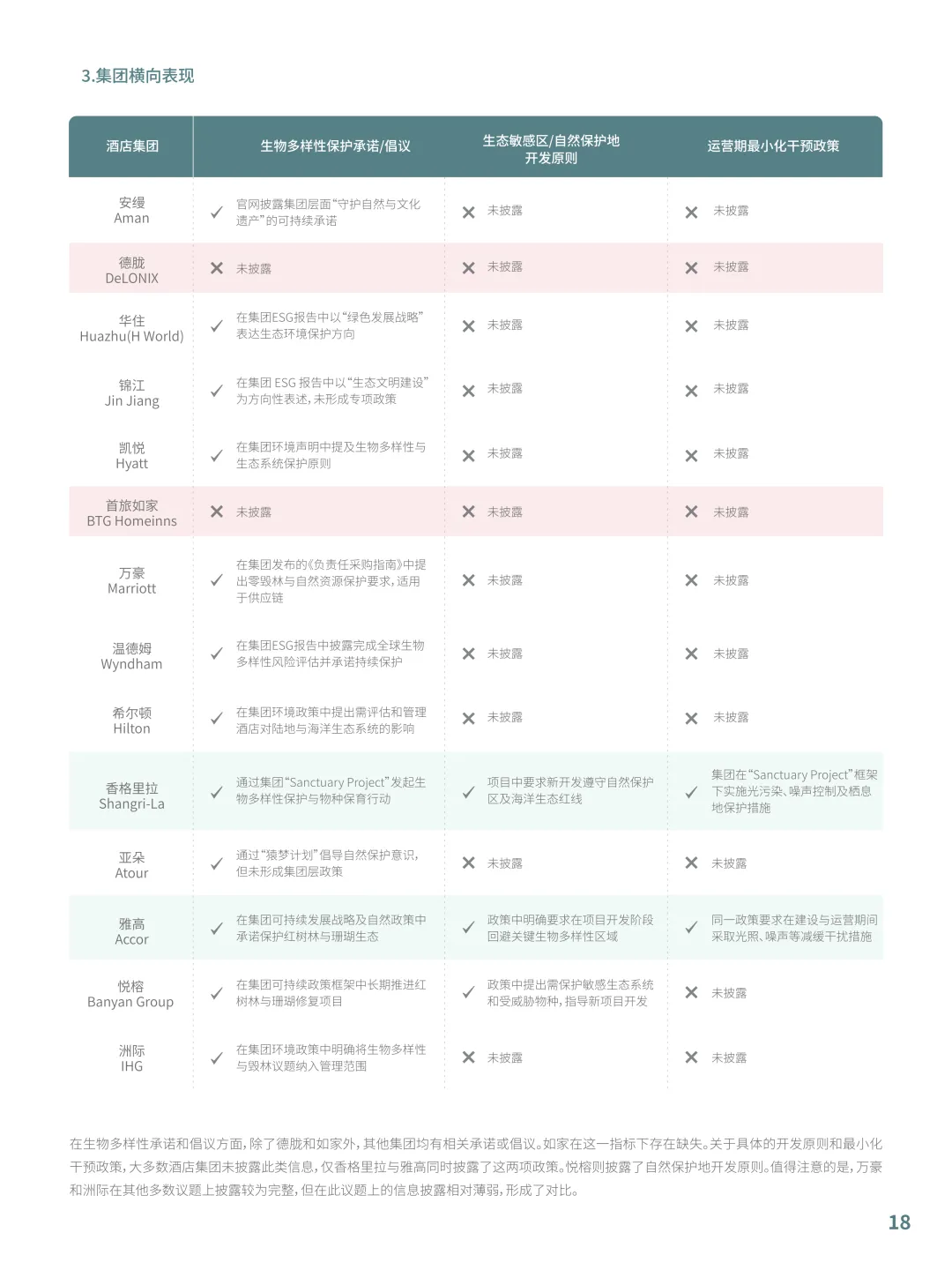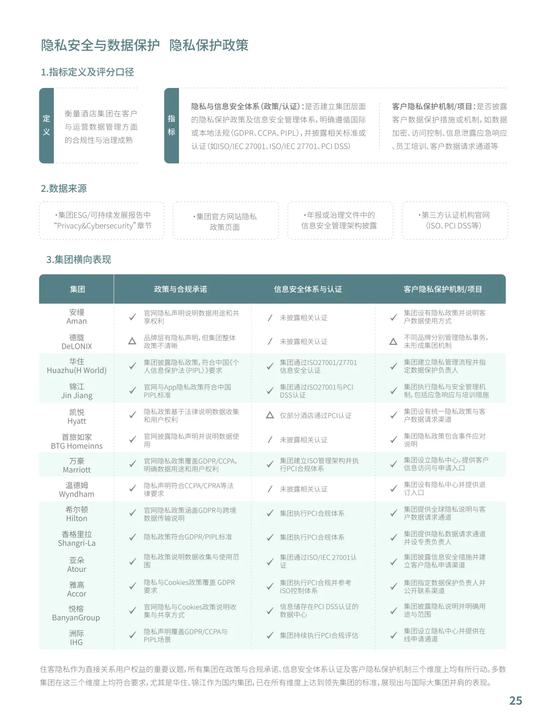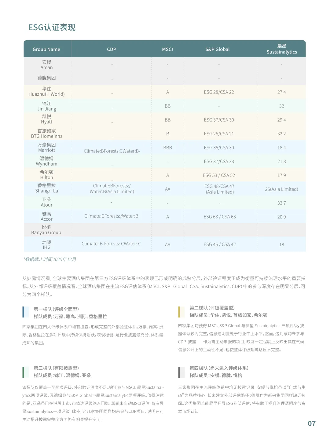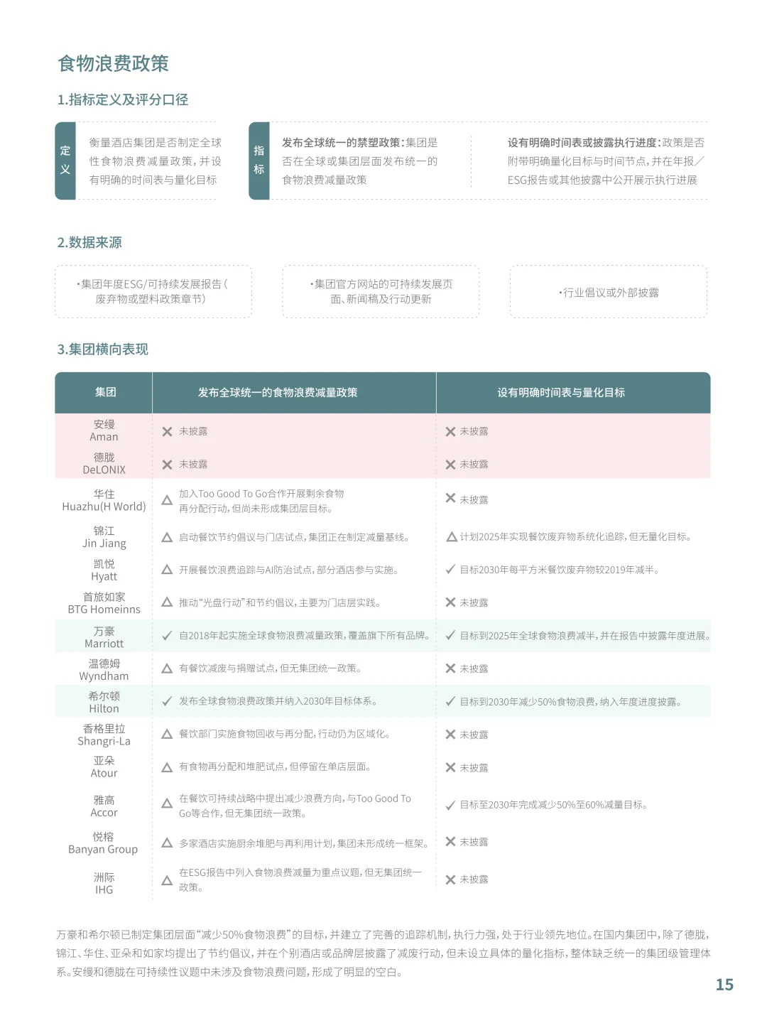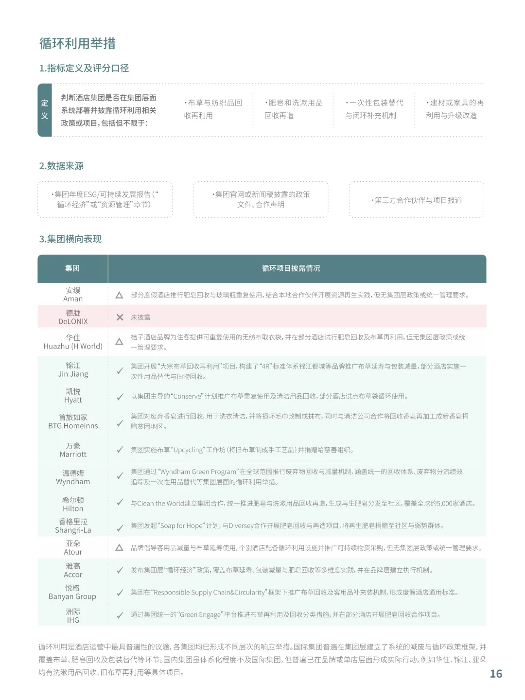 报告聚焦全球酒店行业可持续发展转型,以十四家主流酒店集团为研究样本,构建集团、品牌、单店三层对比体系,系统分析六大核心议题。研究基于公开 ESG 报告、国际认证数据与行业标准,从战略披露、实践落地到外部验证全方位呈现行业现状。行业呈现明显分层特征,国际集团多已建立完整的可持续治理体系,在碳减排、废弃物管理等领域设有量化目标与追踪机制。本土集团虽启动 ESG 披露,但多停留在倡议层面,体系化管理尚处起步阶段。品牌层成为竞争力关键载体,部分领先品牌已形成独立可持续定位与实践路径。可持续实践已从单一环保举措转向全价值链整合,涵盖生态保护、净零运营、循环利用、健康体验、员工关怀与社区共建。报告通过典型案例揭示,成功实践需打通战略传导、体验设计与多方共创,让可持续从管理议题转化为品牌核心价值与用户可感知的生活方式。