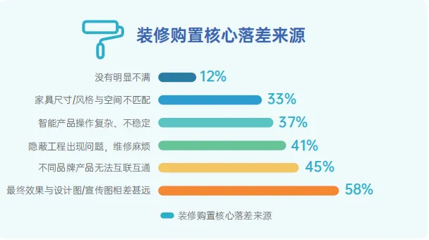 信任折损是居住消费中最突出的信任危机。直播中分享的“效果图诈骗”“隐蔽工程埋雷”“环保宣传虚标”等案例,在行业内早已不是个例。我们发现,部分品牌长期依赖营销驱动而非价值驱动,过度渲染设计效果、夸大产品性能,却忽视了居住的核心诉求——安全与可靠。数据显示,58%的消费者遭遇装修效果与设计图严重不符,41%旧房居住者受水电、防水等隐蔽工程问题困扰,维修需砸墙砸砖、成本高昂。这种“售前承诺天花乱坠,售后问题无人问津”的现象,不断消耗着消费者对行业的信任,让本应是基础保障的安全与健康,反而成为居住中的奢侈品。