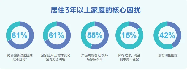 静态空间与动态生活的冲突,引发的未来锁死难题,本质上是行业“一次性交付”思维的必然结果。从二人世界到三口之家,甚至多代同堂,家庭结构与生活需求的变化是必然规律,但当前多数装修仍采用“固化设计”“一次性采购”模式。数据显示,61%居住3年以上的家庭,因改造成本高、怕破坏装修,放弃局部翻新;55%的消费者面临产品老化损坏,维修成本高的问题。“当初重金打造的潮流空间,最终因无法适配生活变化而沦为鸡肋”,这背后是行业对居住需求的短期化认知,忽视了家的成长属性。