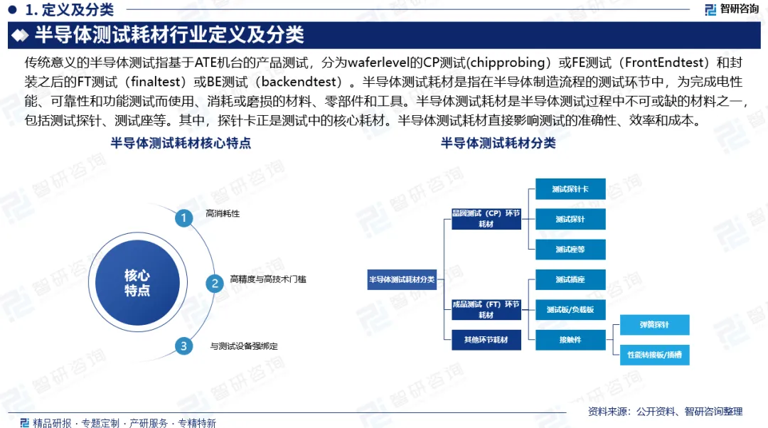 行业定义及特点:半导体测试耗材是指在半导体制造流程的测试环节中,为完成电性能、可靠性和功能测试而使用、消耗或磨损的材料、零部件和工具。半导体测试耗材是半导体测试过程中不可或缺的材料之一,包括测试探针、测试座等。其中,探针卡正是测试中的核心耗材。半导体测试耗材直接影响测试的准确性、效率和成本。