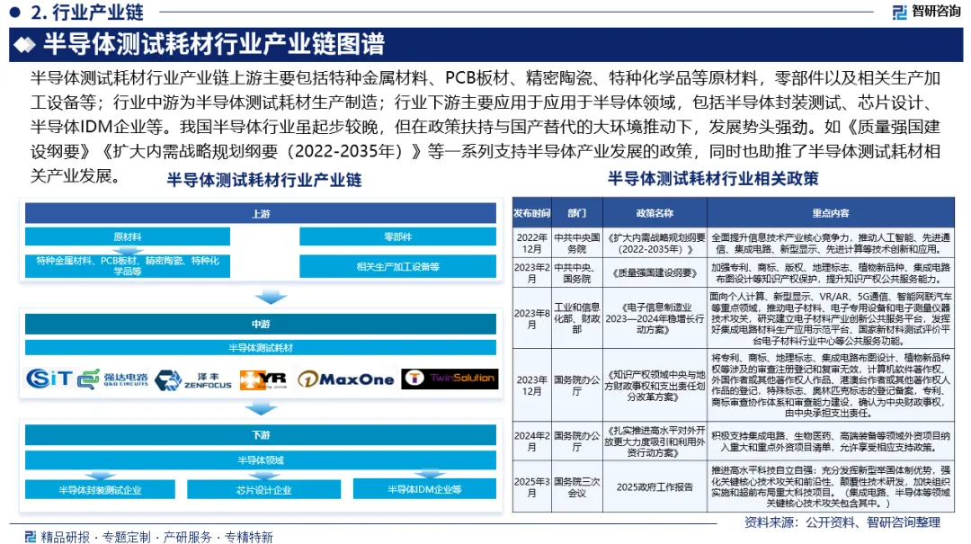 行业相关政策:我国半导体行业虽起步较晚,但在政策扶持与国产替代的大环境推动下,发展势头强劲。如《电子信息制造业2023—2024年稳增长行动方案》《扩大内需战略规划纲要(2022-2035年)》等一系列支持半导体产业发展的政策,同时也助推了半导体测试耗材相关产业发展。