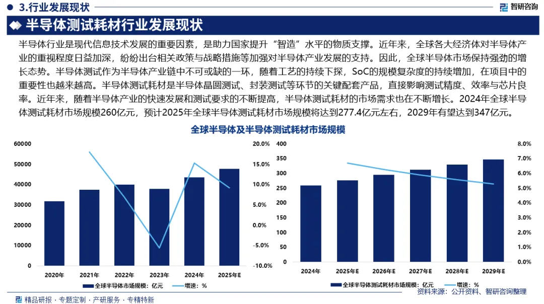 半导体测试耗材是指在半导体制造流程的测试环节中,为完成电性能、可靠性和功能测试而使用、消耗或磨损的材料、零部件和工具。半导体行业是现代信息技术发展的重要因素,是助力国家提升“智造”水平的物质支撑。近年来,全球各大经济体对半导体产业的重视程度日益加深,纷纷出台相关政策与战略措施等加强对半导体产业发展的支持。因此,全球半导体市场保持强劲的增长态势。半导体测试作为半导体产业链中不可或缺的一环,随着工艺的持续下探,SoC的规模复杂度的持续增加,在项目中的重要性也越来越高。半导体测试耗材是半导体晶圆测试、封装测试等环节的关键配套产品,直接影响测试精度、效率与芯片良率。近年来,随着半导体产业的快速发展和测试要求的不断提高,半导体测试耗材的市场需求也在不断增长。2024年全球半导体测试耗材市场规模260亿元,预计2025年全球半导体测试耗材市场规模将达到277.4亿元左右,2029年有望达到347亿元。
