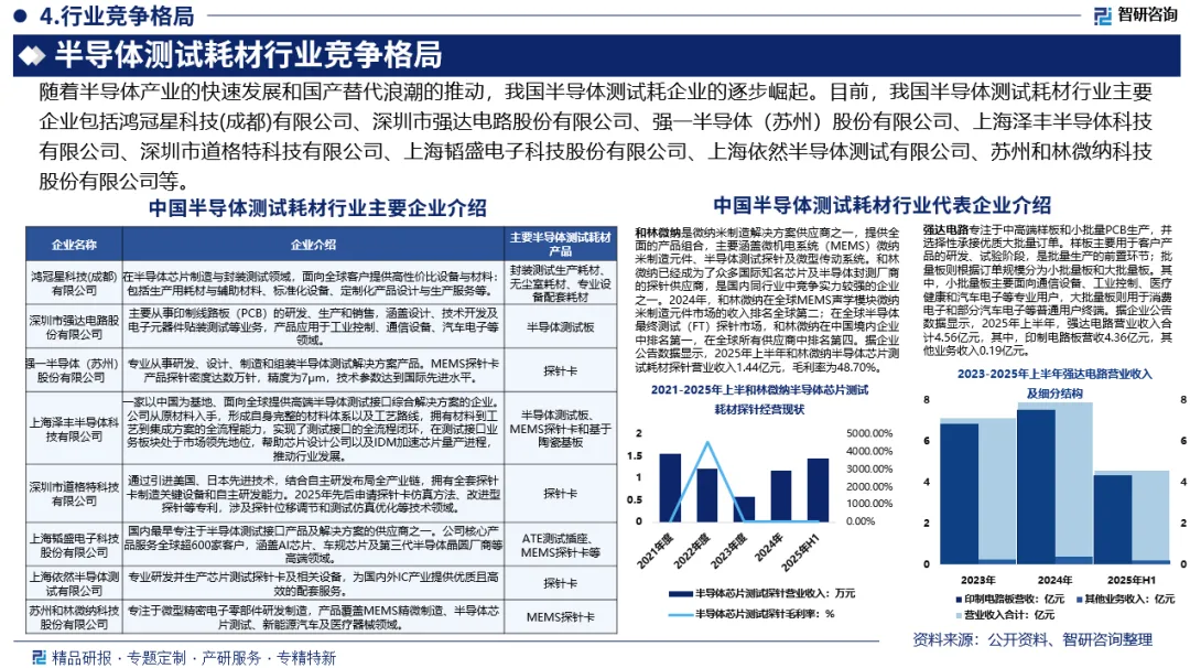 竞争情况:随着半导体产业的快速发展和国产替代浪潮的推动,我国半导体测试耗企业的逐步崛起。目前,我国半导体测试耗材行业主要企业包括鸿冠星科技、深圳市强达电路、强一半导体(苏州)、上海泽丰半导体、深圳市道格特科技、上海韬盛电子、上海依然半导体、苏州和林微纳等。