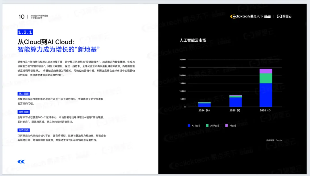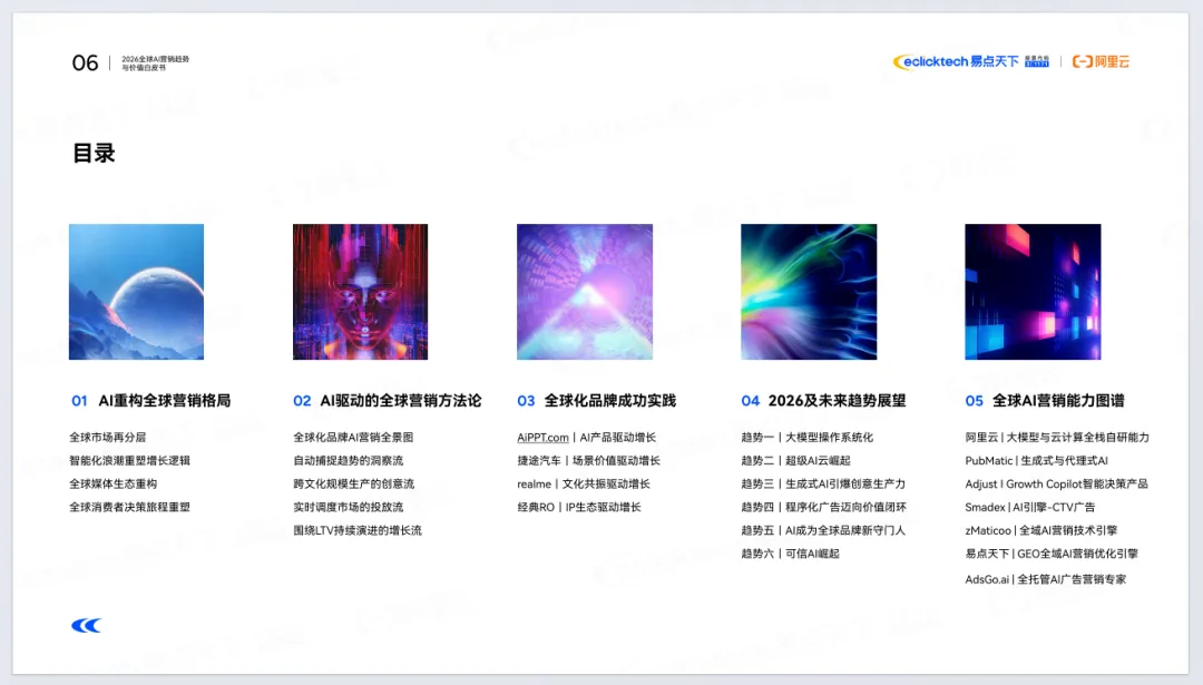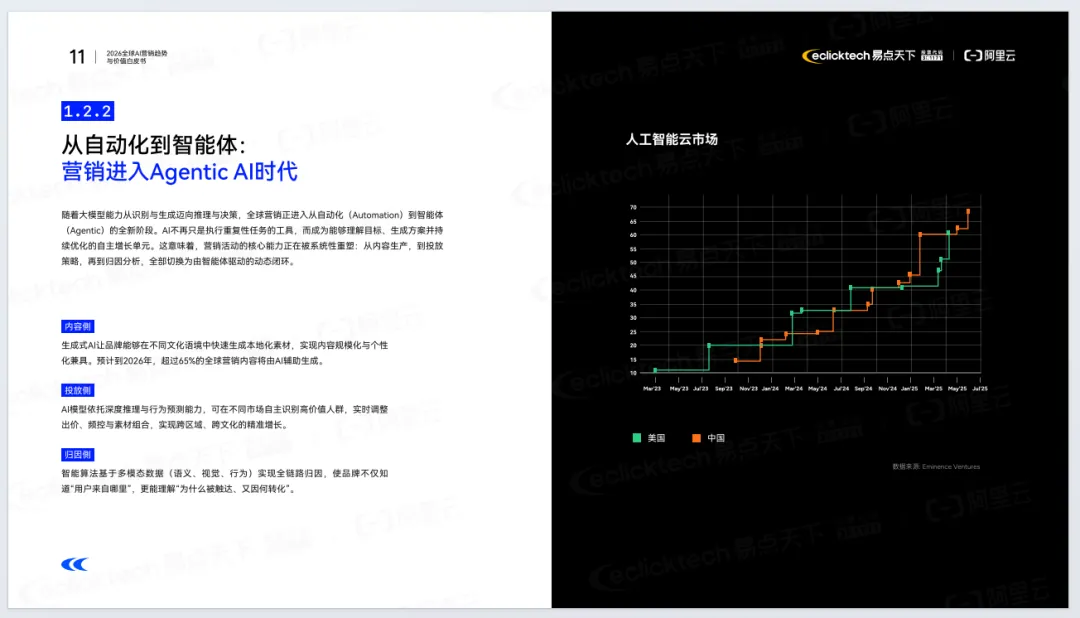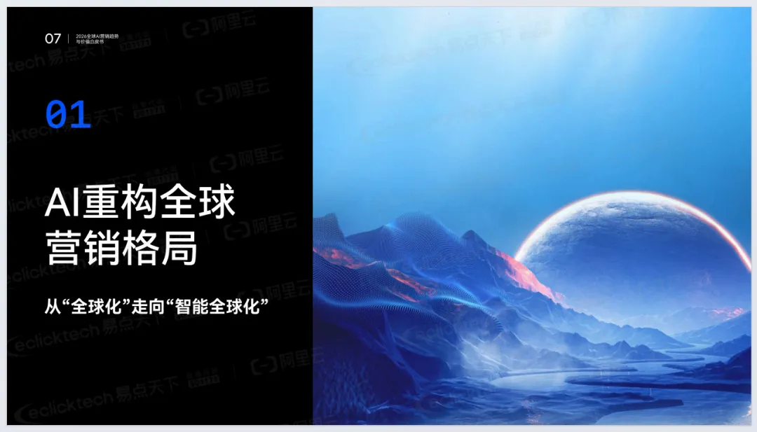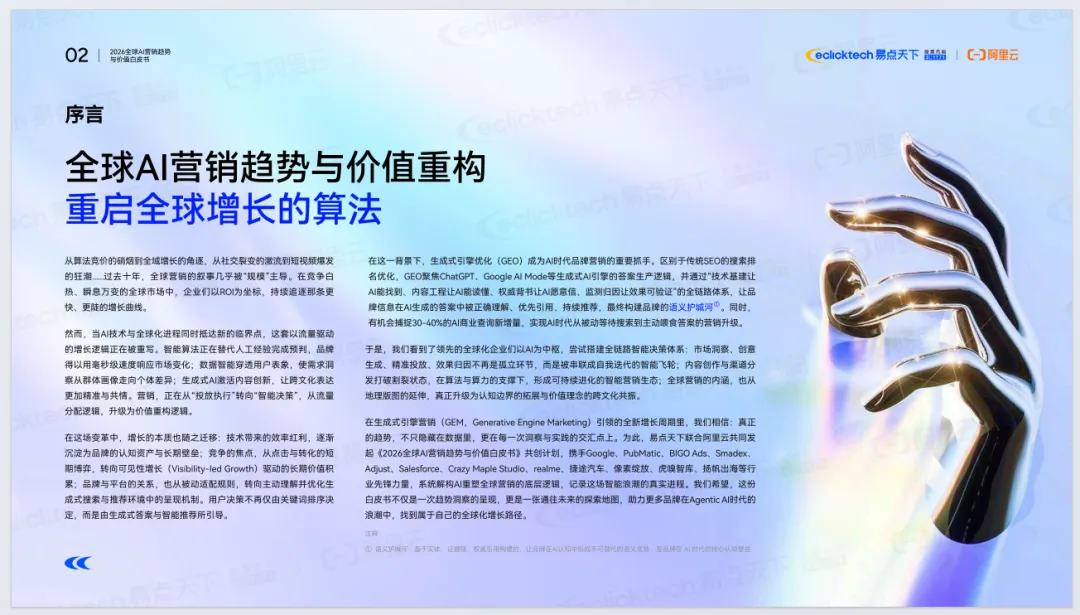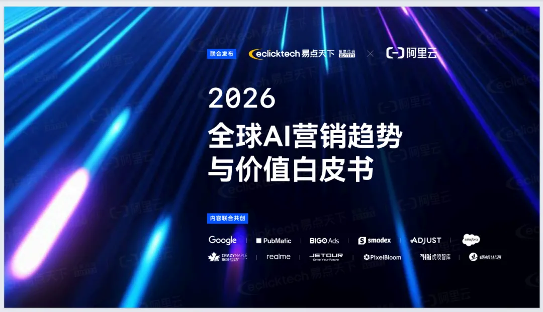 《2026年全球AI营销趋势与价值白皮书》由易点天下联合阿里云发布,聚焦AI重塑全球营销的底层逻辑。报告指出,全球营销正从流量驱动转向价值重构,进入Agentic AI时代,AI从辅助工具升级为核心基础设施与决策引擎。