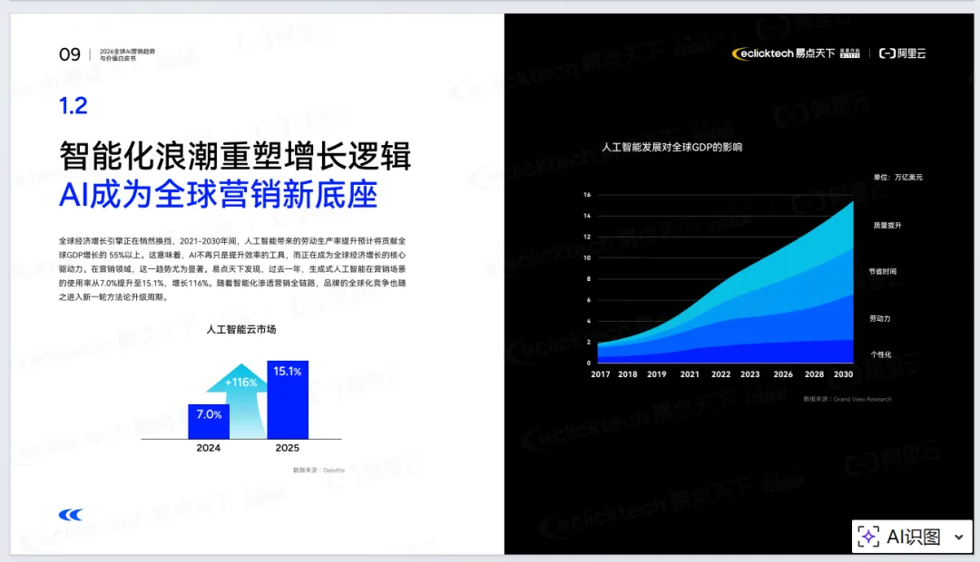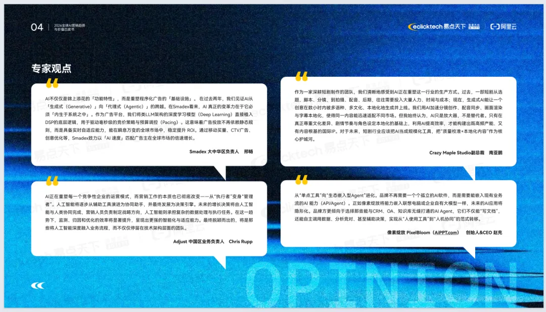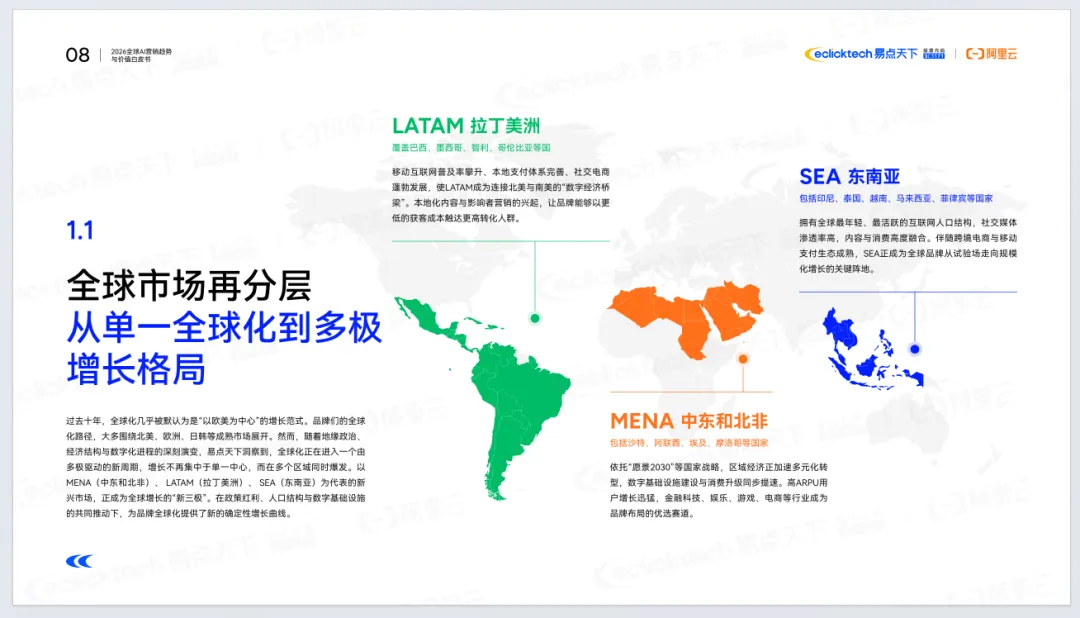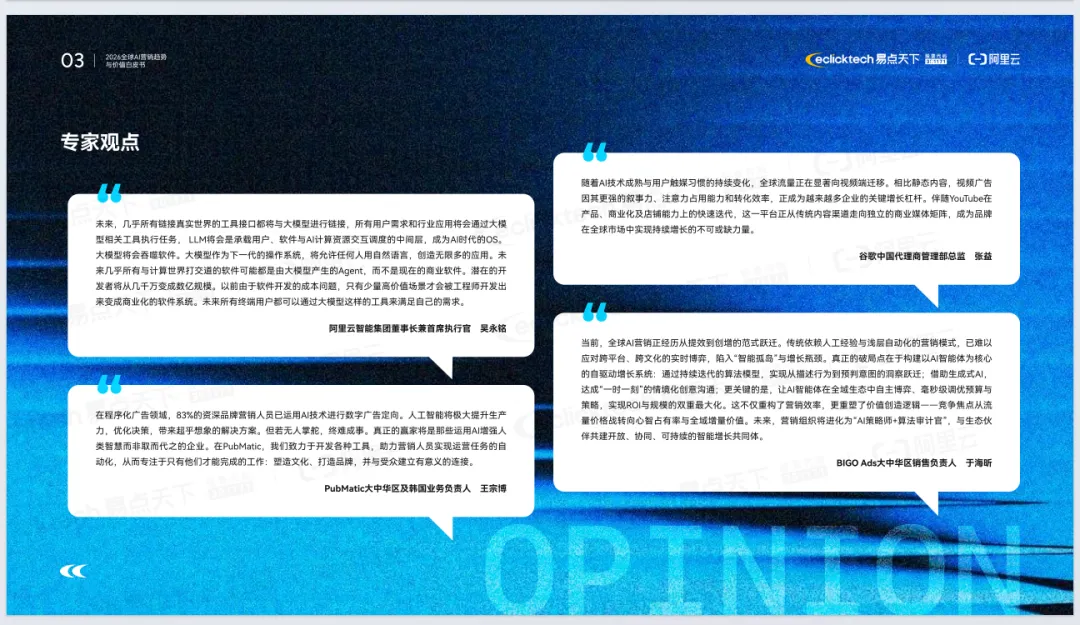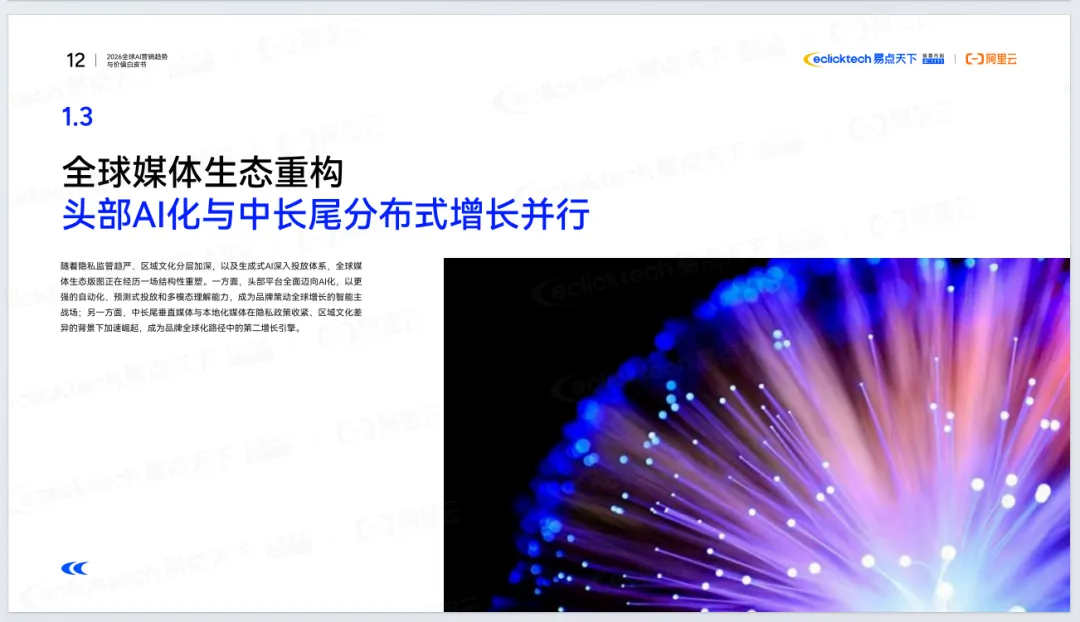 《2026年全球AI营销趋势与价值白皮书》由易点天下联合阿里云发布,聚焦AI重塑全球营销的底层逻辑。报告指出,全球营销正从流量驱动转向价值重构,进入Agentic AI时代,AI从辅助工具升级为核心基础设施与决策引擎。