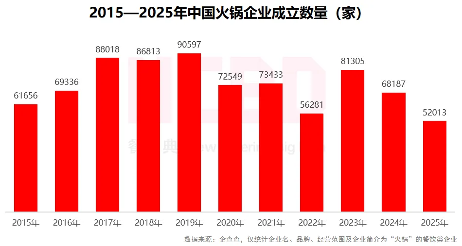 3、2025年火锅品类竞争异常激烈。数据显示,2025年,中国火锅相关餐饮企业成立数量较上一年继续下降,降幅超过20%