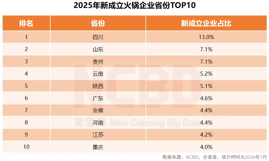 4、NCBD(餐宝典)数据显示,2025年新成立火锅企业数量最多的省是四川,数量占全国总量的13.0%;山东、贵州分别位居二、三位;TOP10省份新成立火锅企业占全国总量的59.2%,接近六成
