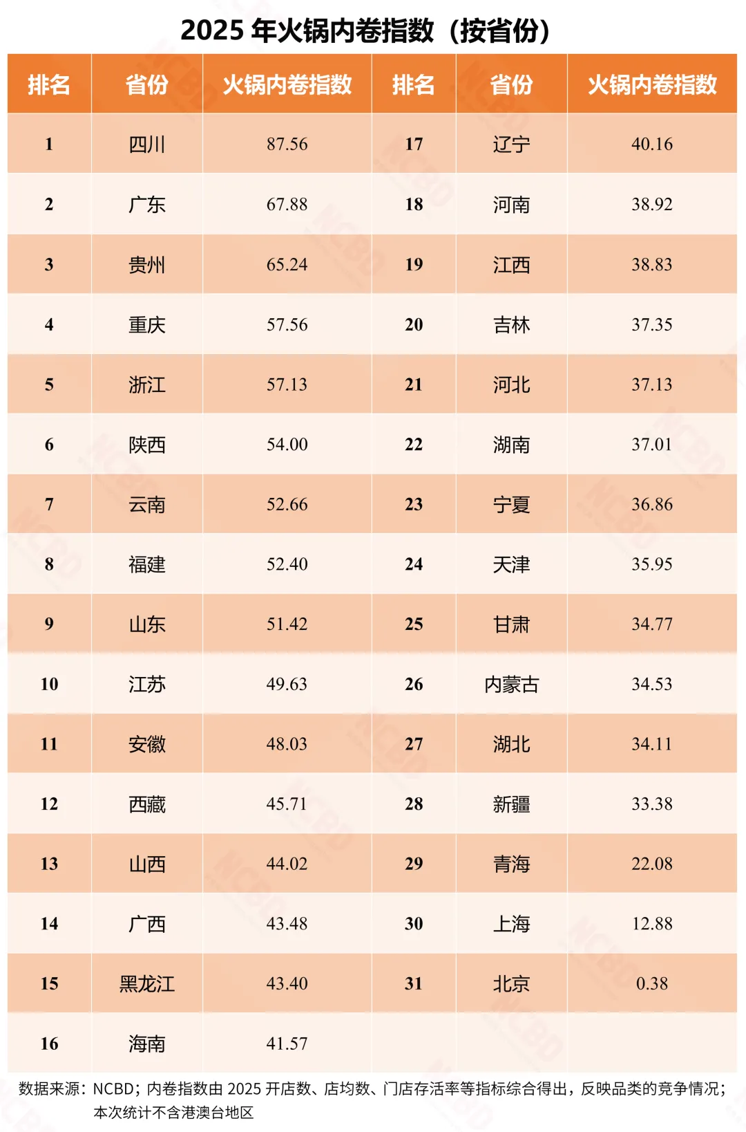 11、从火锅内卷情况来看,四川排名全国第一,内卷指数高达87.56,远超其他省份;广东、贵州分别位居二、三位;上海、北京等地的火锅内卷指数较低,北京只有0.38,全国最低