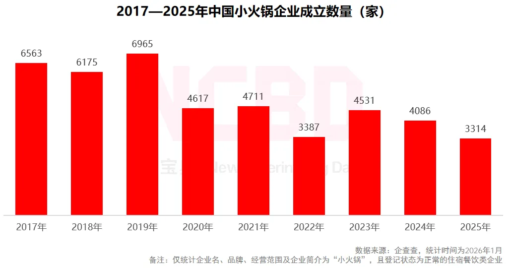 (1)2019年全国小火锅企业成立数量近7000家,此后开始下降;2025年成立的小火锅企业数量只有3300多家,与2019年相比有大幅缩水