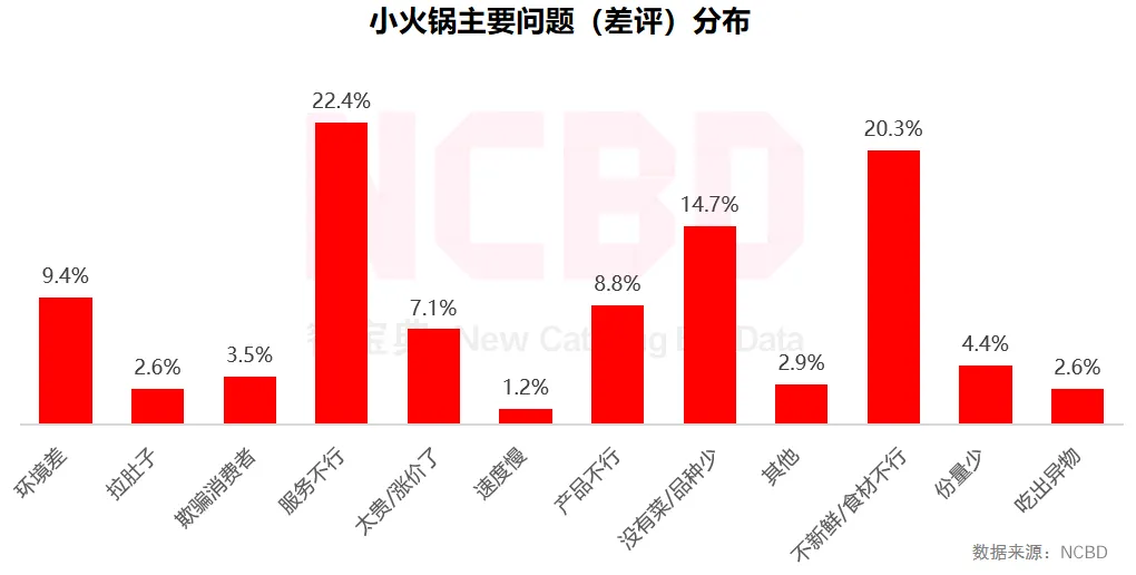 (5)从小火锅的差评分布来看,主要的问题集中在服务、食材、菜量、环境以及价格等方面,尤其是在食材方面问题较为普遍